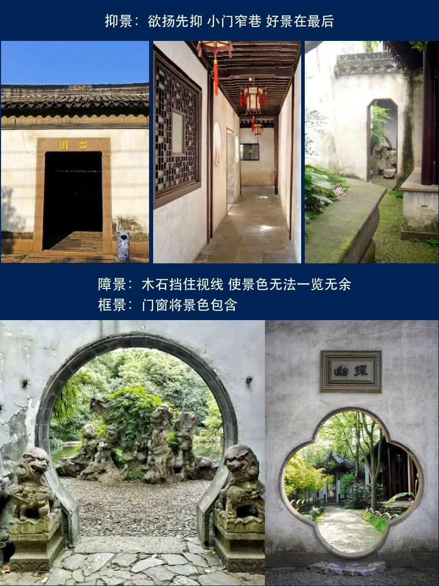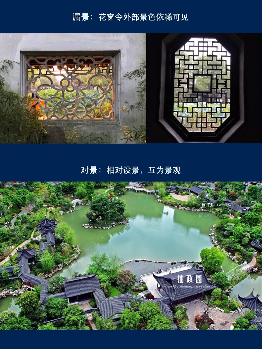 🌿不过园林之美,还需造景呈现。比如留园,开始是抑景,入园先进窄巷,前后遇小、大天井,再是方厅花窗透出水景,这叫漏景,而后才走向花园宴厅,视野逐渐明朗丰富。