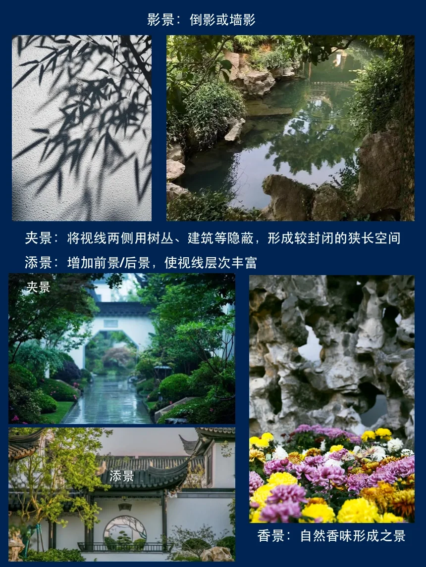 🌿此外,我们还能在园林中感受到,树影映墙的影景、乔木遮远山的添景、屋木架主景的夹景、花香沁心脾的香景等等。