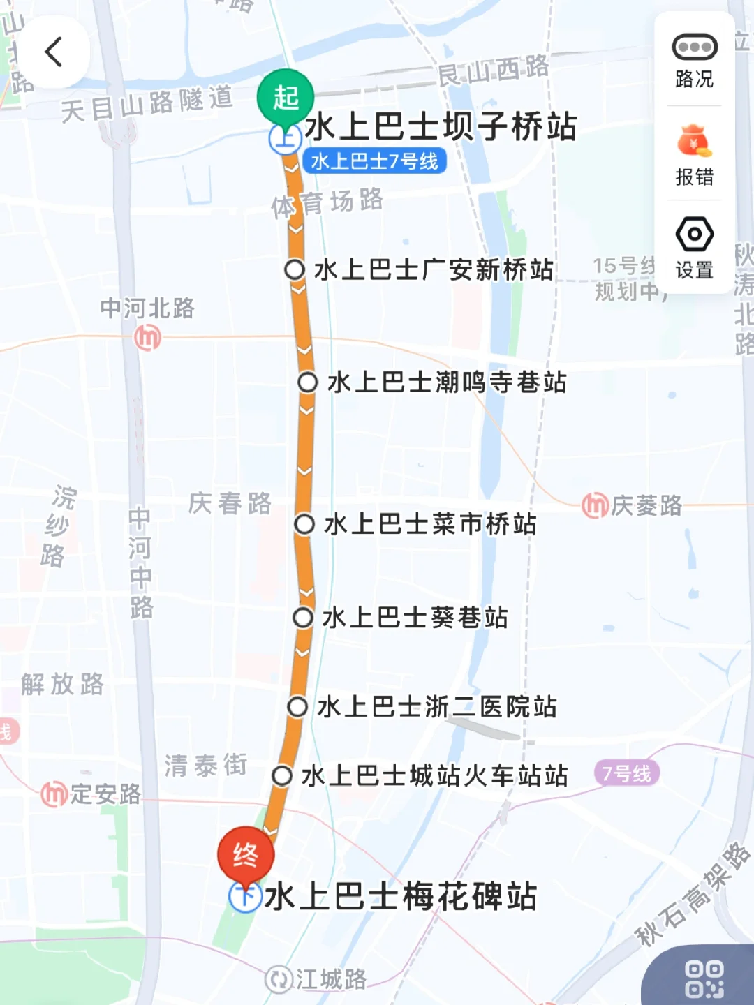 东河坝子桥-宝善桥-广安新桥-潮鸣寺巷-菜市桥-葵阳-浙二医院-火车站-东河梅花碑(全程约50min)
