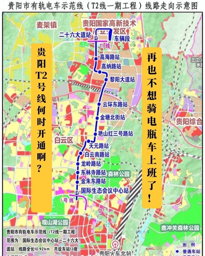 贵阳有轨电车T2线,走向上是从高新区,南北贯穿白云区、观山湖,一直到观山湖金融城的国际生态会议中心站,沿途经过二十六大道、高海路、黎阳大道、云环东路、白云南路、金朱东路等站点。