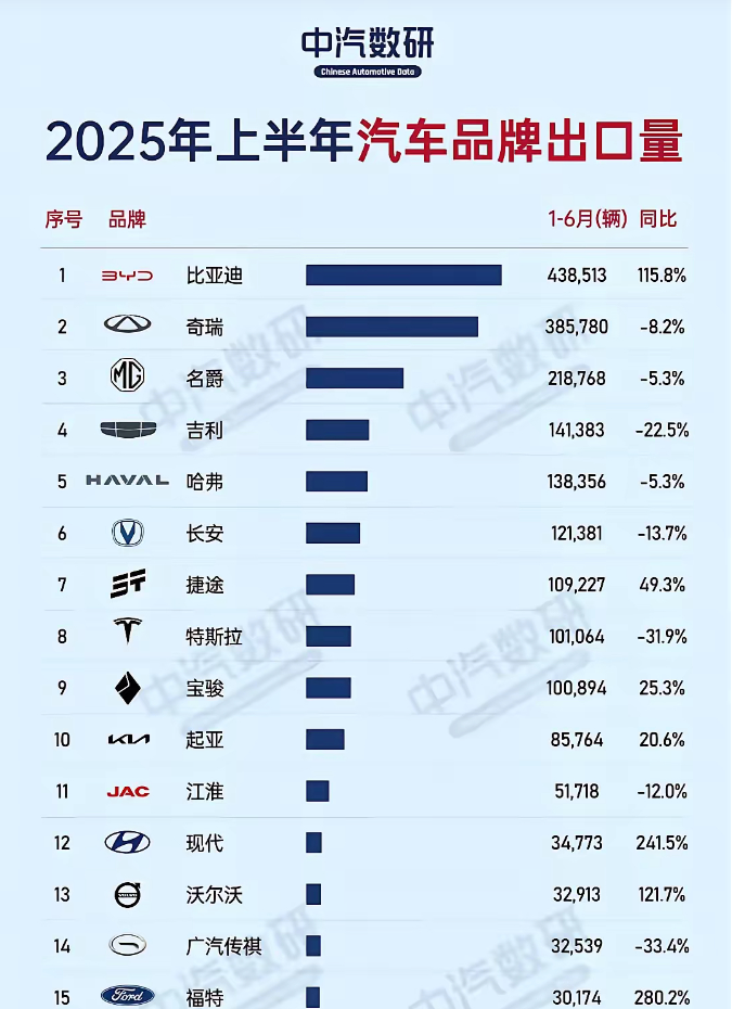 这是中汽研公布的2025年上半年中国汽车品牌的出口数据。