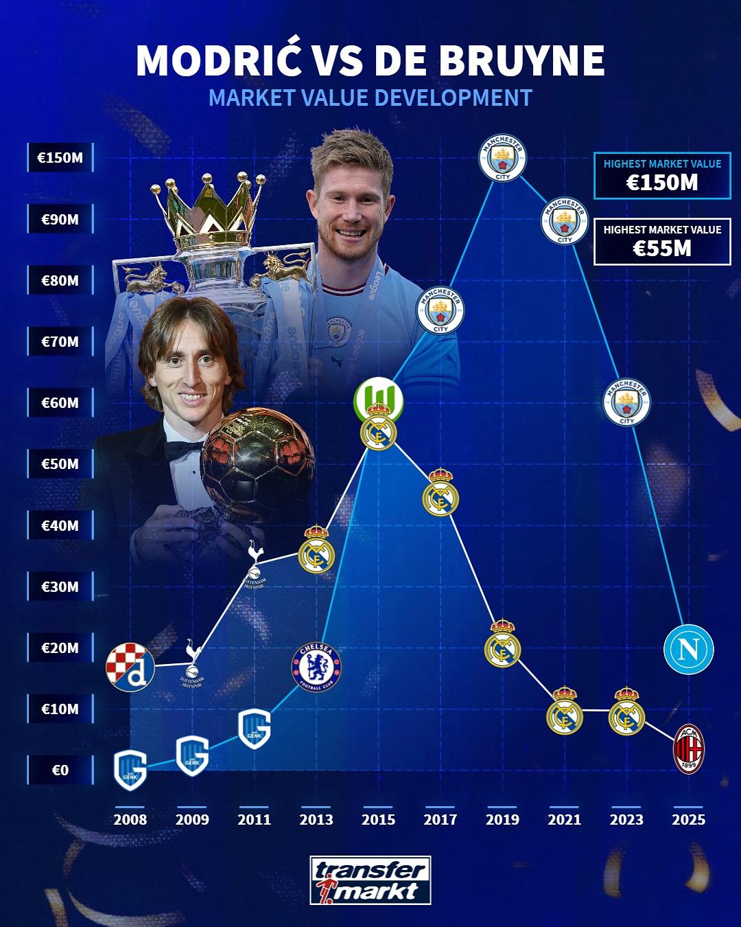 莫德里奇在2015年之前的身价高于德布劳内,之后德布劳内的身价更高;莫德里奇职业生涯的身价最高峰是5500万欧元,德布劳内则是1.5亿欧元。