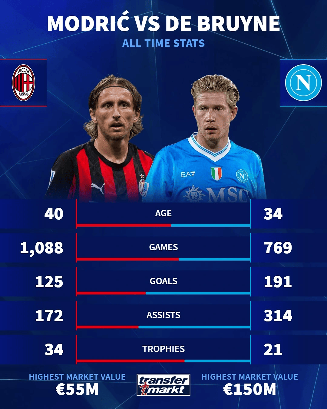 德布劳内职业生涯的进球/助攻数都要多于莫德里奇,不过莫德里奇比小他6岁的德布劳内多赢得13座奖杯。