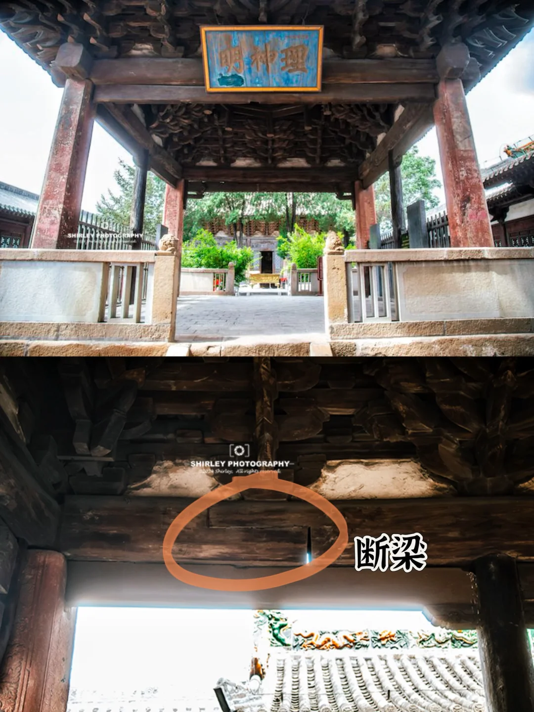 断梁位于献亭东侧,中间断开却互相吻合,支撑着这座亭子度过了500年风雨。使用断梁可能有两个原因,一是为木材的热胀冷缩留下空间,二是当时大木材紧缺,只能如此拼凑使用。