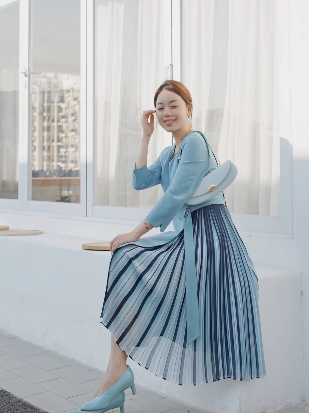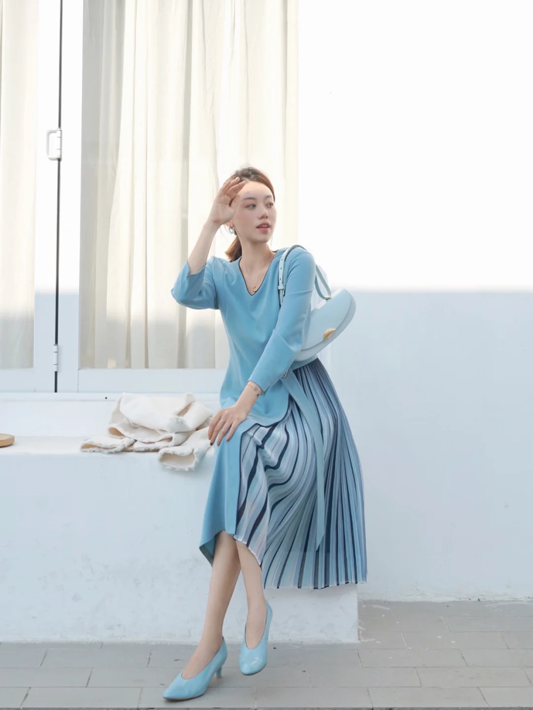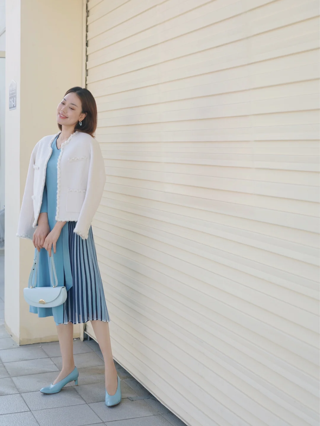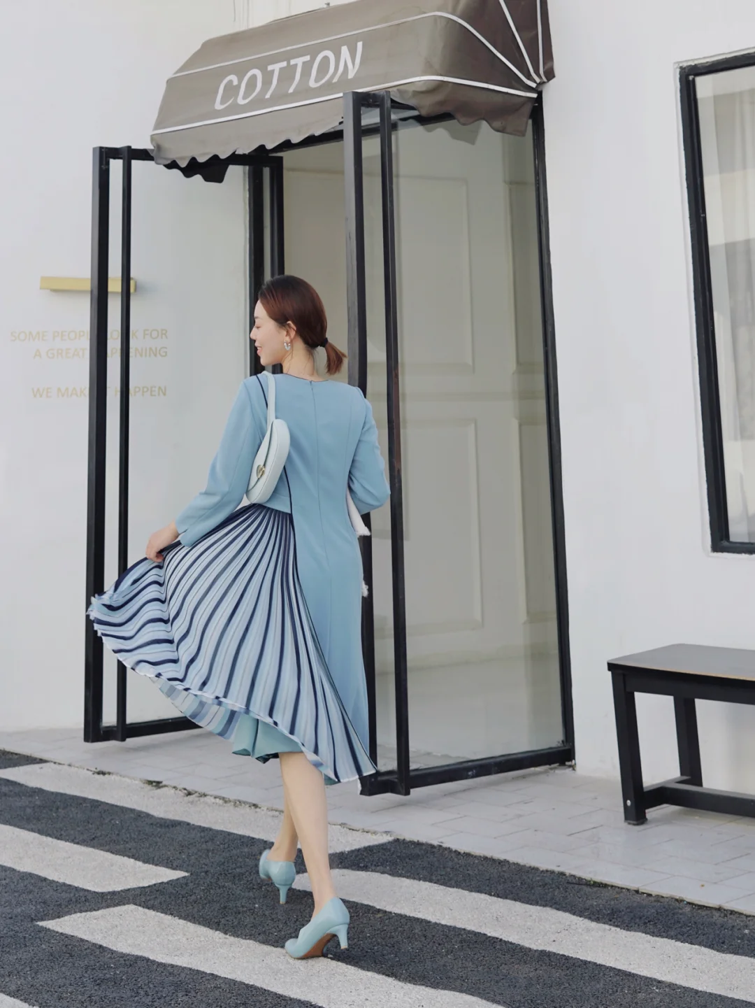 - 好久没有买到喜欢的连衣裙啦,在NAERSI逛了一圈,发现这个蓝色通勤连衣裙,颜色非常抬人,长度也刚刚好,丝感面料细腻的手感太舒服了,裙摆的拼接压褶设计别出心裁,兼具趣味与艺术感,通勤,约会都可以穿,随便套个小外套就更加适合现在的天气~喜欢! - OOTD 裙子:NAERSI 包:Asocial 鞋子:simple retro 外套:zhizhi