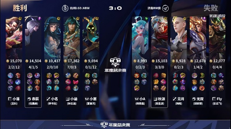 直播吧9月29日讯2025王者荣耀年度总决赛本场比赛是由杭州LGD.NBW对阵到济南RW侠!第一局:双方前期难分胜负互相拿节奏,后期LGD凭借奔狼开团打赢调整后成功拿下首局!第二局:RW前期通过抱团抓人打出节奏,十分钟LGD赢下暴君团后帮助马超完成发育,LGD成功拿下首局胜利!第三局:前期RW凭借阵容打出优势,但是十分钟RW失误决策被LGD抓到机会逆转比赛,LGD成功拿下比赛胜利!