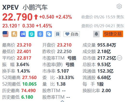 格隆汇9月29日|小鹏汽车(XPEV.US)盘前涨1.45%,报23.12美元。消息面上,小鹏汽车官方昨日宣布,小鹏MONAM03已累计交付180000台。上市12个月连续月交付量超1万台,并连续12个月获纯电A轿销量冠军。(格隆汇)