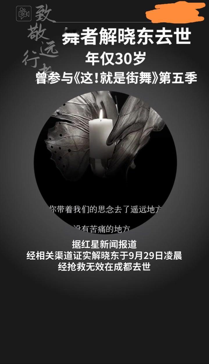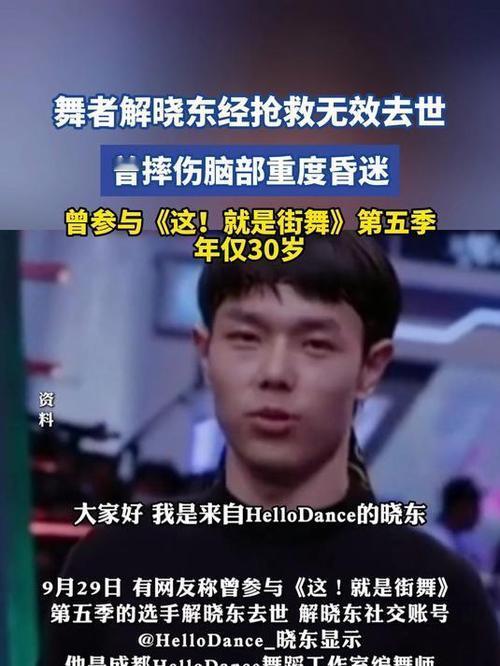 2025年9月29日凌晨,曾登上《这!就是街舞》第五季舞台的青年舞者解晓东,因颅脑损伤抢救无效,在成都不幸离世,年仅30岁。 解晓东是成都HelloDance舞蹈工作室的核心编舞师。2024年5月14日,他在工作室排练时意外摔伤脑部,此后一直处于重度昏迷状态,最终未能战胜伤病,令人扼腕。