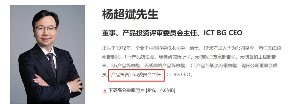 从官网信息来看,杨超斌现任华为产品投资评审委员会主任。其毕业于华中科技大学,1998年加入华为公司,历任无线预研部部长、LTE产品线总裁、瑞典研究所所长、无线解决方案部部长、5G产品线总裁、ICT产品与解决方案总裁等职,现任公司董事会成员、产品投资评审委员会主任、ICTBGCEO。