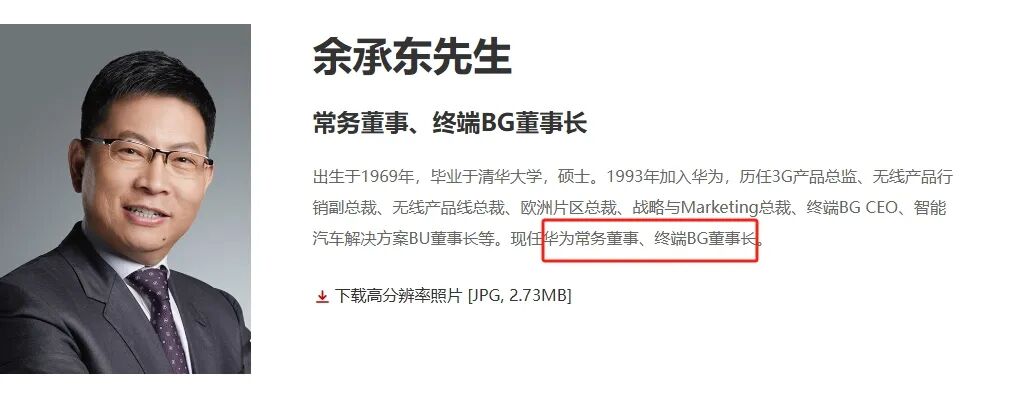记者注意到,截至发稿,余承东的官网头衔和微博认证均显示为“常务董事、终端BG董事长”,尚未更新最新职位。