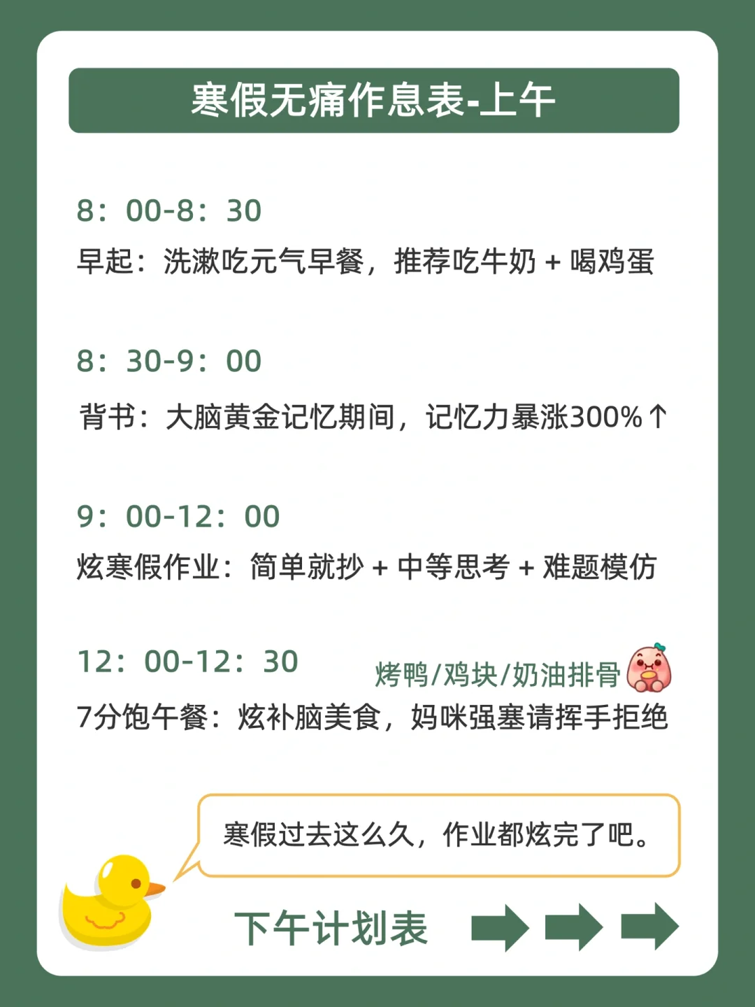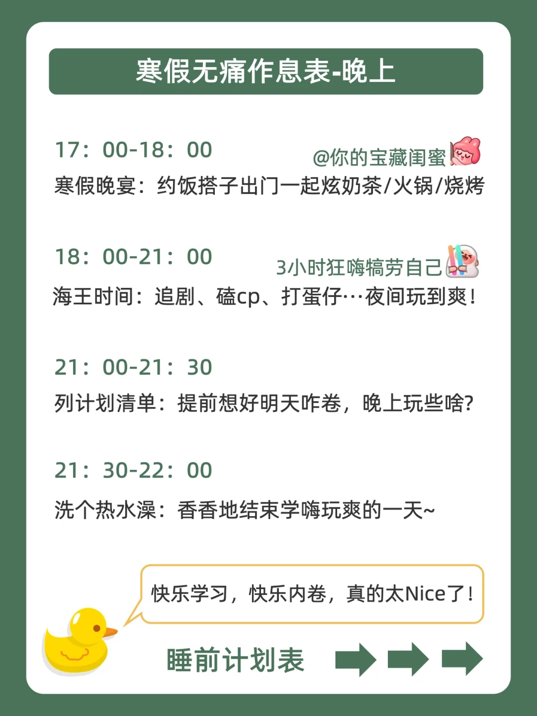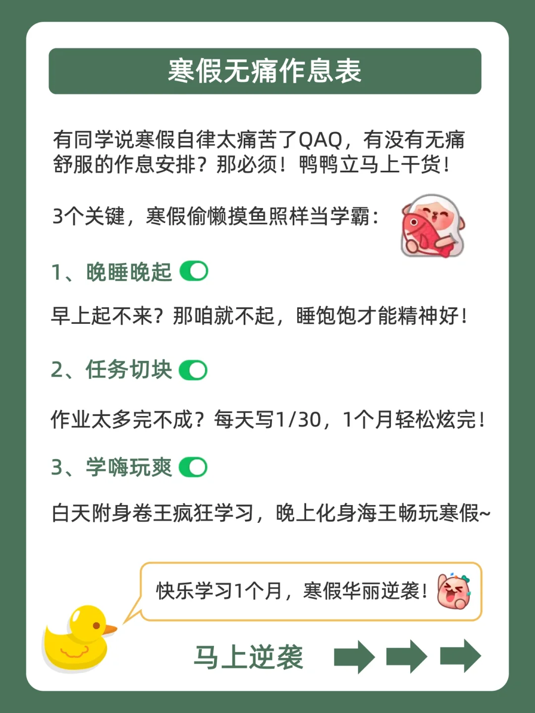 · [赞R]寒假摆烂不用怕,鸭鸭带你做学霸❗️ · [哇R]拿下寒假懒人无痛作息表,学嗨玩爽就在于此!🚀 · 🔥搭配懒人刷词神器「无痛单词」,像刷短视频一样刷单词,学习上头嘎嘎有趣❗ · ️🐣我是鸭鸭,持续分享更多优质学习方法,陪宝子们快乐学习,寒假逆袭!🌊