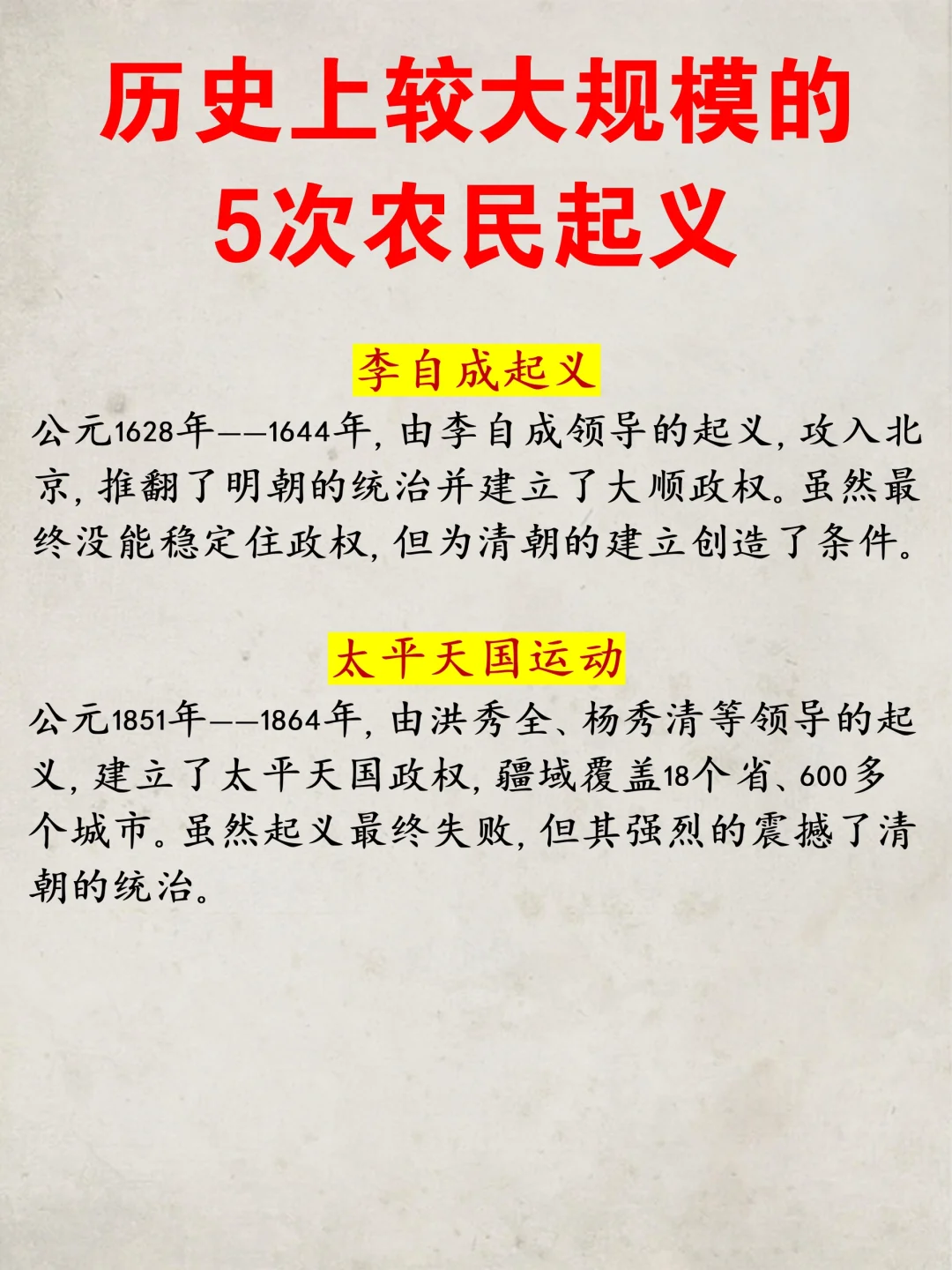 历史最著名的5次农民起义,“带头人”的下场,却都出奇相似! 👉古代历史上有许多的起义发生,其中大部分皆为农民起义,只因他们遭受当朝统治者的压迫,无法过上安稳的生活,无奈之下唯有拿起武器进行自我反抗。提及农民起义,大家熟知的着实不少,例如陈胜吴广的奋起反抗,还有近代的太平天国等等。 👉然而,古代历史上存有最为著名的五次农民起义,其 “带头人” 的结局,却皆出奇地相似!