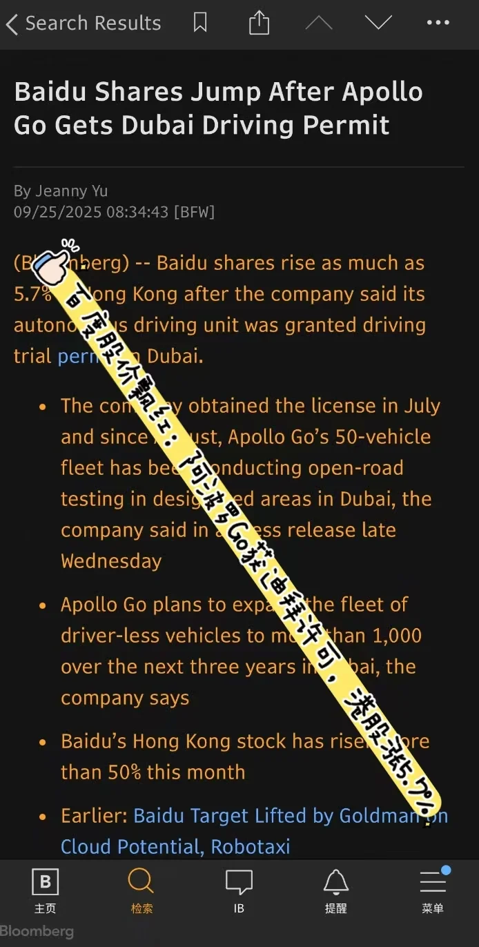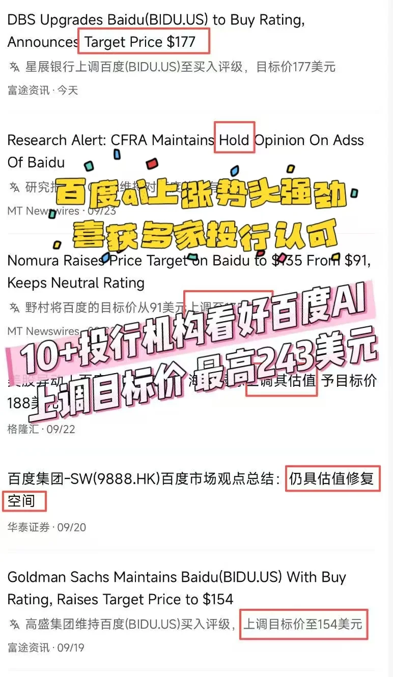 [得意R]不光业务上亮眼,百度最近股价也特别给力。9月24号当天,美股直接涨了快10%,港股更猛,涨到2023年9月以来的新高,整个9月算下来涨了54%还多。更关键的是近三个月,花旗、高盛那些大机构都集体看涨,最高把目标价提到243美金,这说明行业和市场是真认它现在的方向。