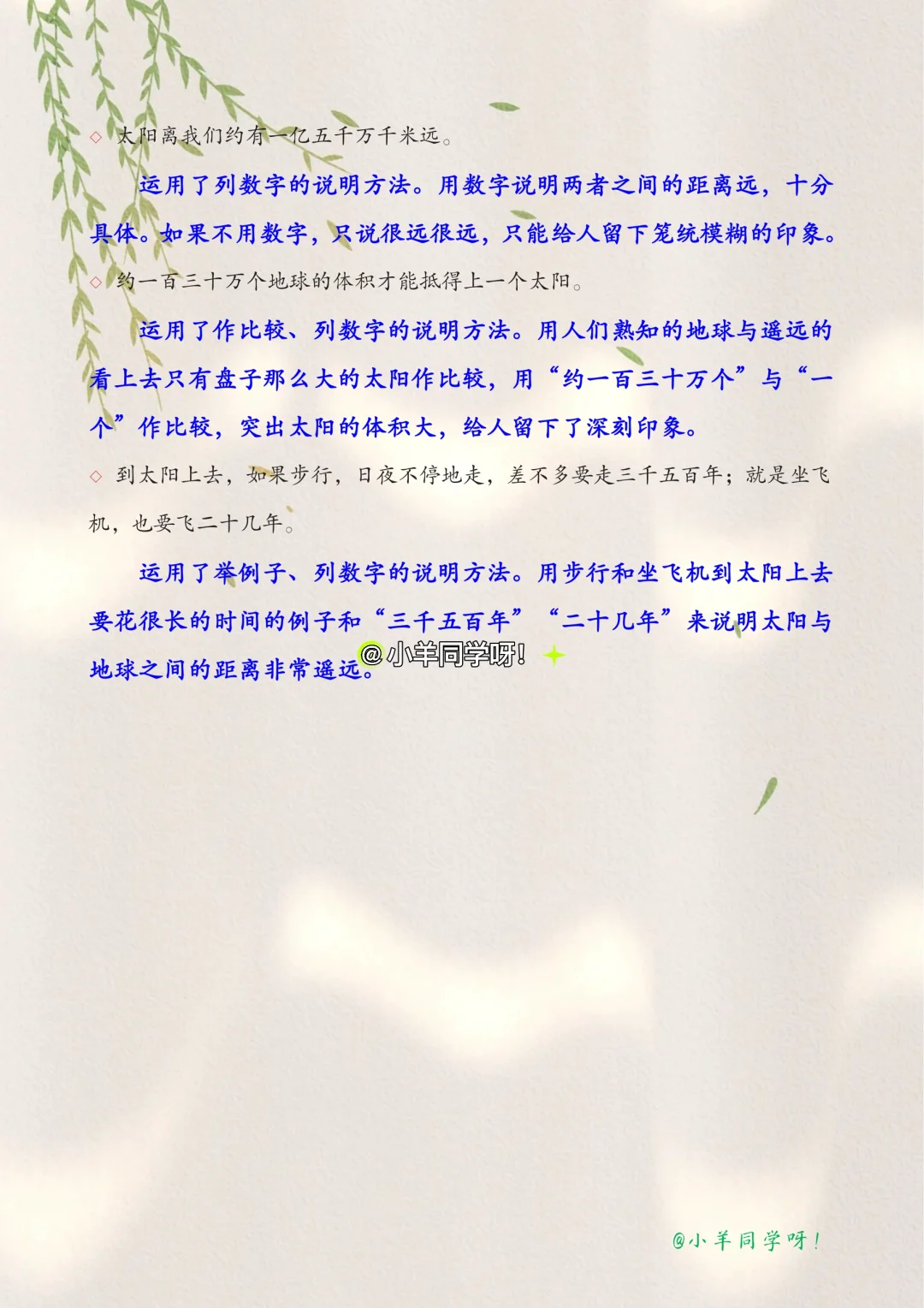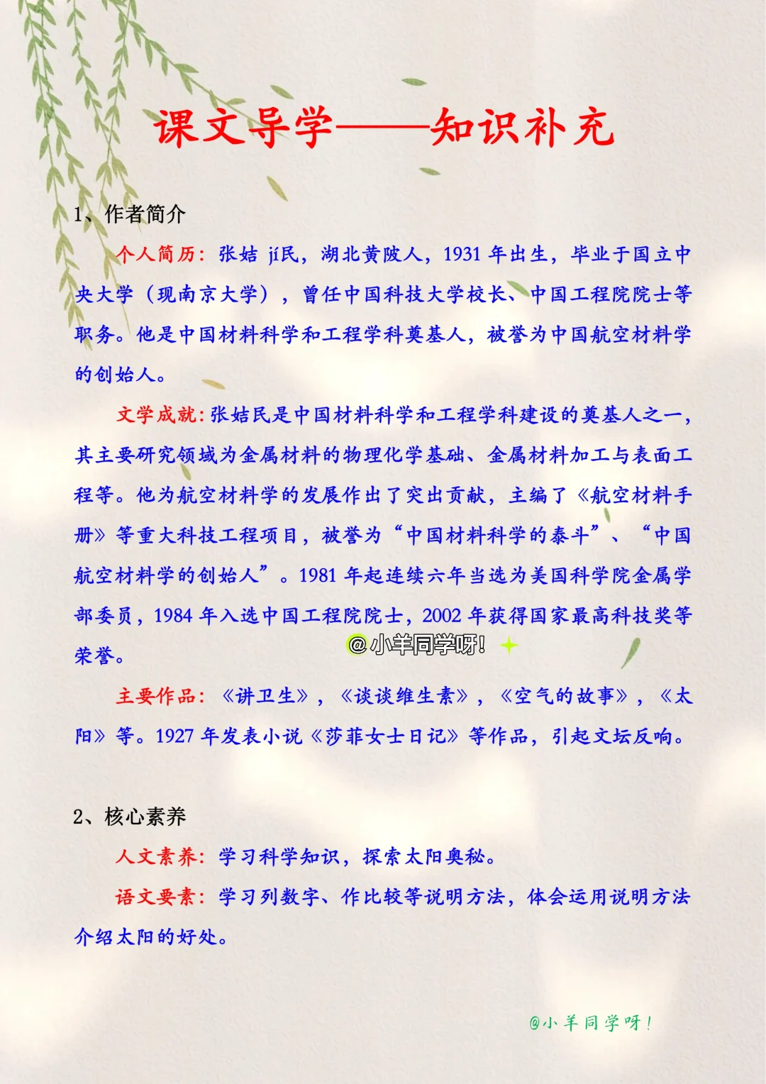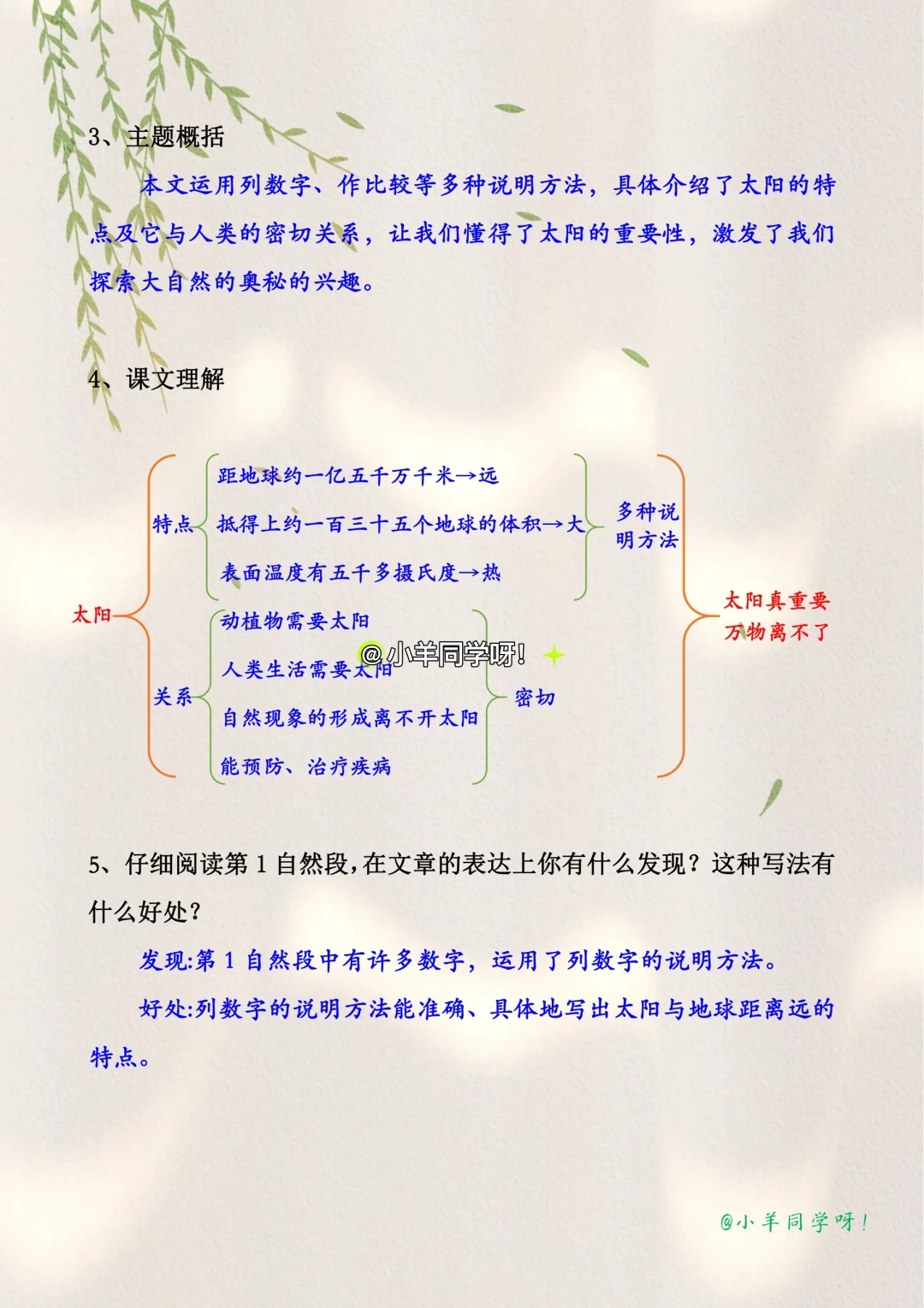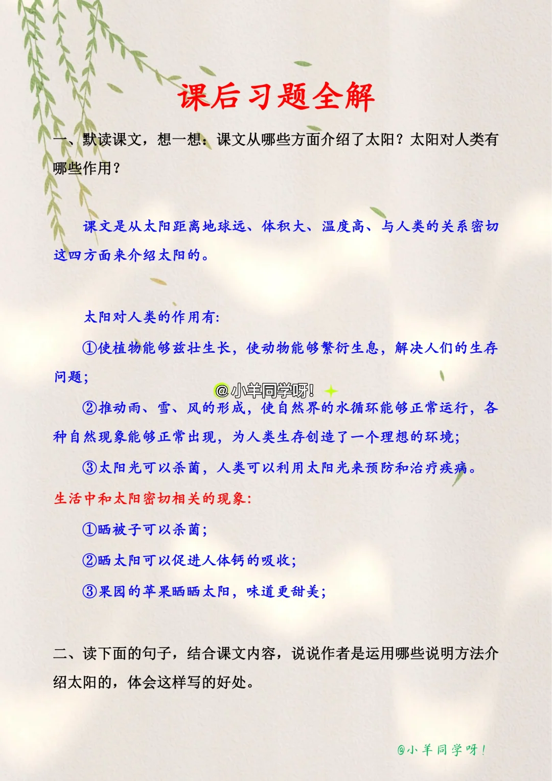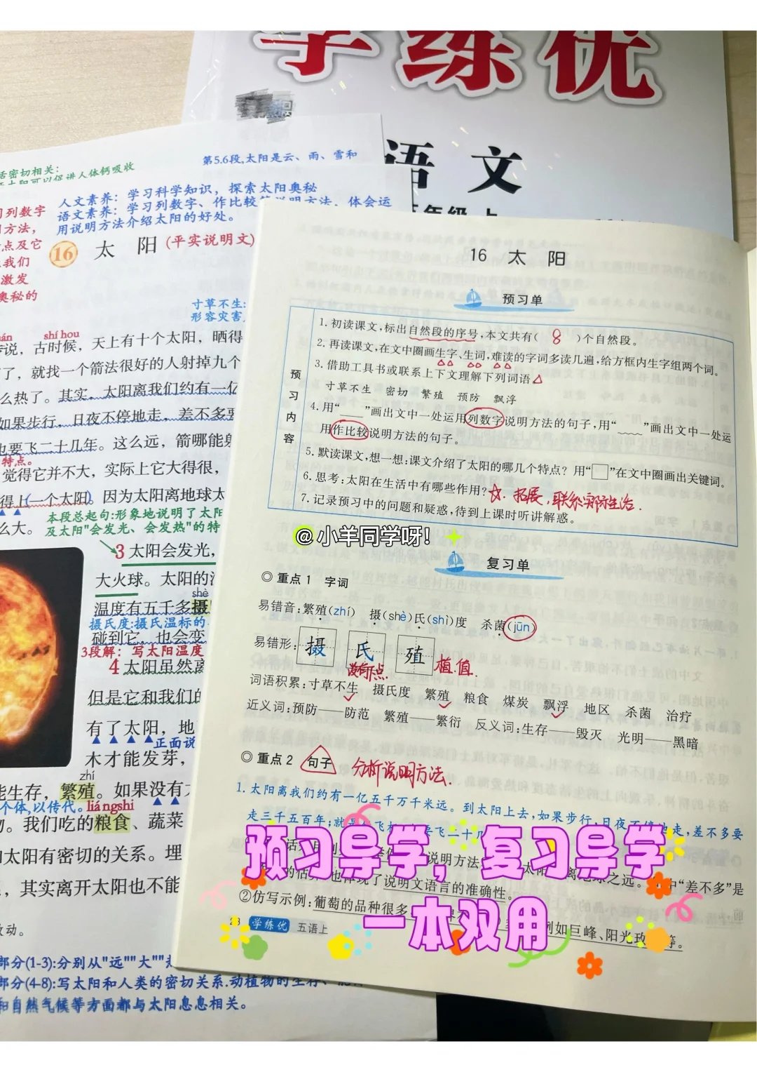 《太阳》 本文运用列数字、作比较等多种说明方法,具体介绍了太阳的特点及它与人类的密切关系,让我们懂得了太阳的重要性,激发了我们探索大自然的奥秘的兴趣。 ---------------------------- 本次笔记我用了“优翼”的内附《预习复习单》,以及《学练优》,里面的题目可以作为课后习题补充。 ---------------------------- 一份教辅涵盖学前学后所有需求,贴近教材,深入拓展~[派对R]