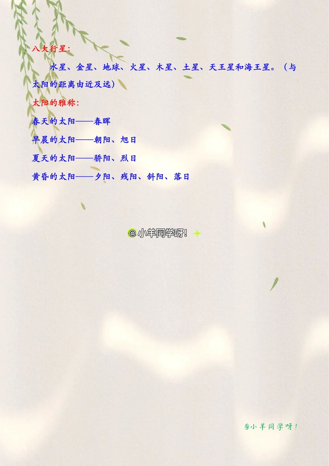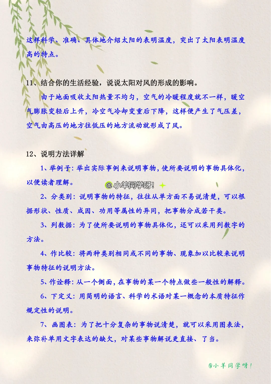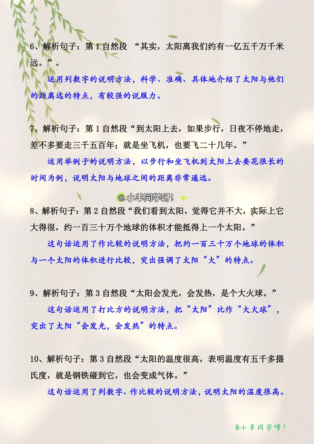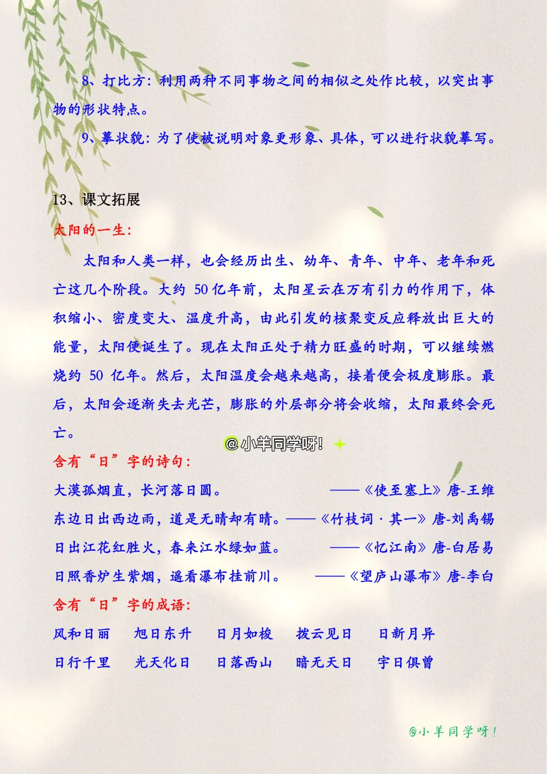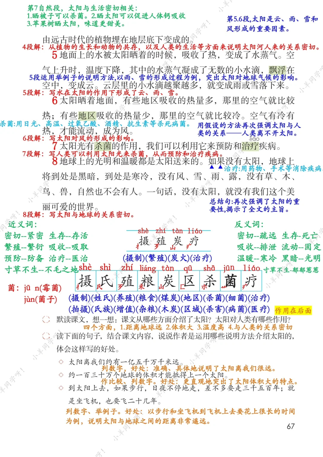 《太阳》 本文运用列数字、作比较等多种说明方法,具体介绍了太阳的特点及它与人类的密切关系,让我们懂得了太阳的重要性,激发了我们探索大自然的奥秘的兴趣。 ---------------------------- 本次笔记我用了“优翼”的内附《预习复习单》,以及《学练优》,里面的题目可以作为课后习题补充。 ---------------------------- 一份教辅涵盖学前学后所有需求,贴近教材,深入拓展~[派对R]