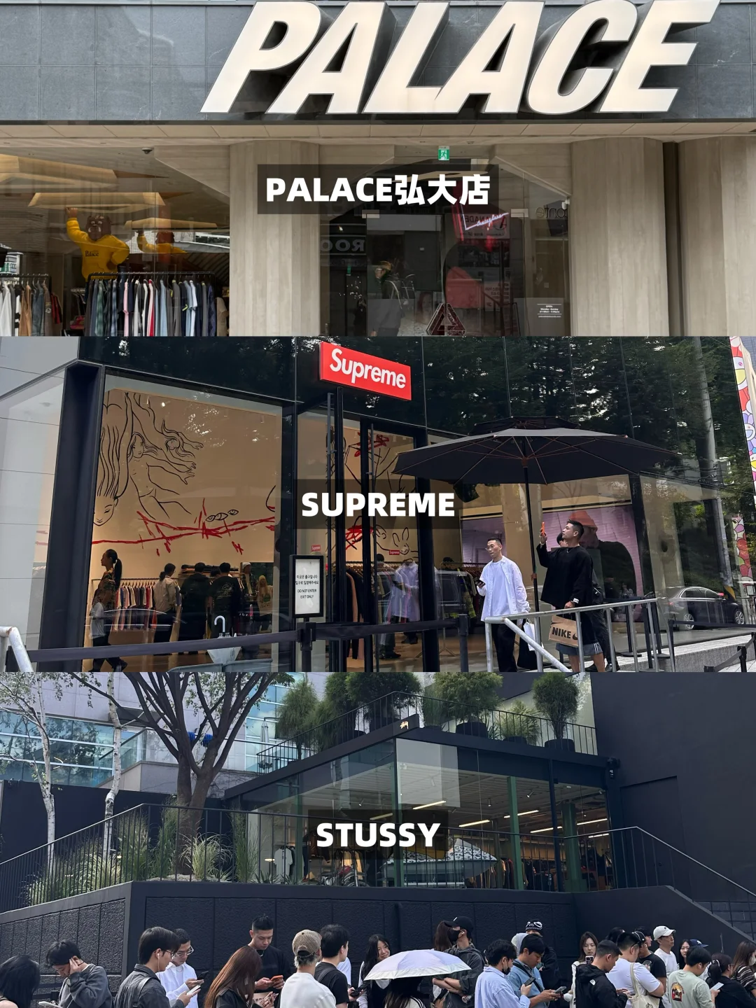 三巨头不让拍照,PALACE店内还有NBHD联名,SUPREME要趁周六上新去比较好,STUSSY我周一中午去依然要排队,没进去了