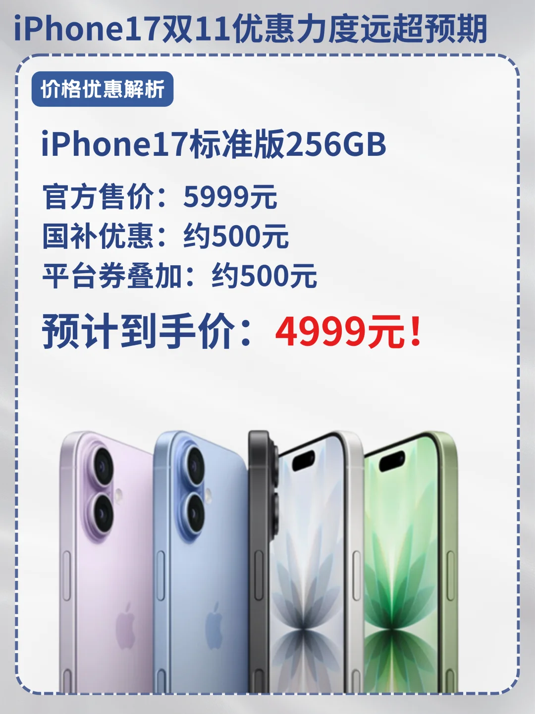 宝子们双11快到了!预计iPhone17标准版可叠加国补和惊喜券后,到手价直接干到4999元,比首发便宜整整1000块,而且是256G!加量不加价,性价比拉满!