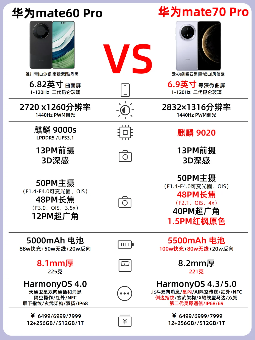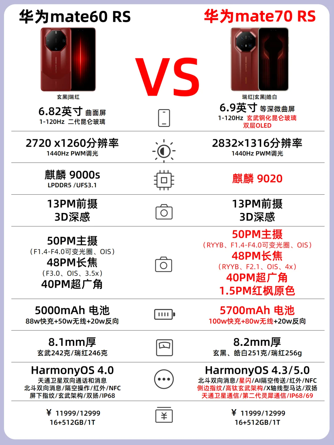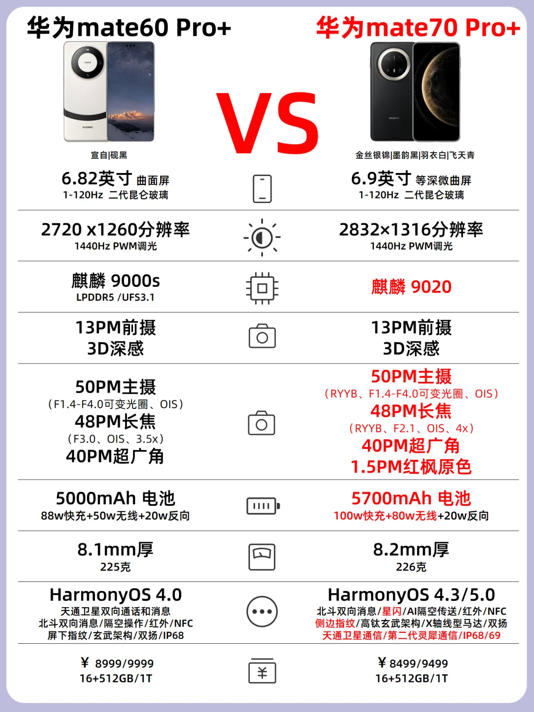 💡颜色:华为mate70标准版和Pro颜色一致都是云衫绿、曜石黑、雪域白、风信紫,而Pro+为金丝银锦、墨韵黑、羽衣白、飞天青这四种颜色,RS非凡大师这次有三种颜色分别为瑞红、玄黑、皓白