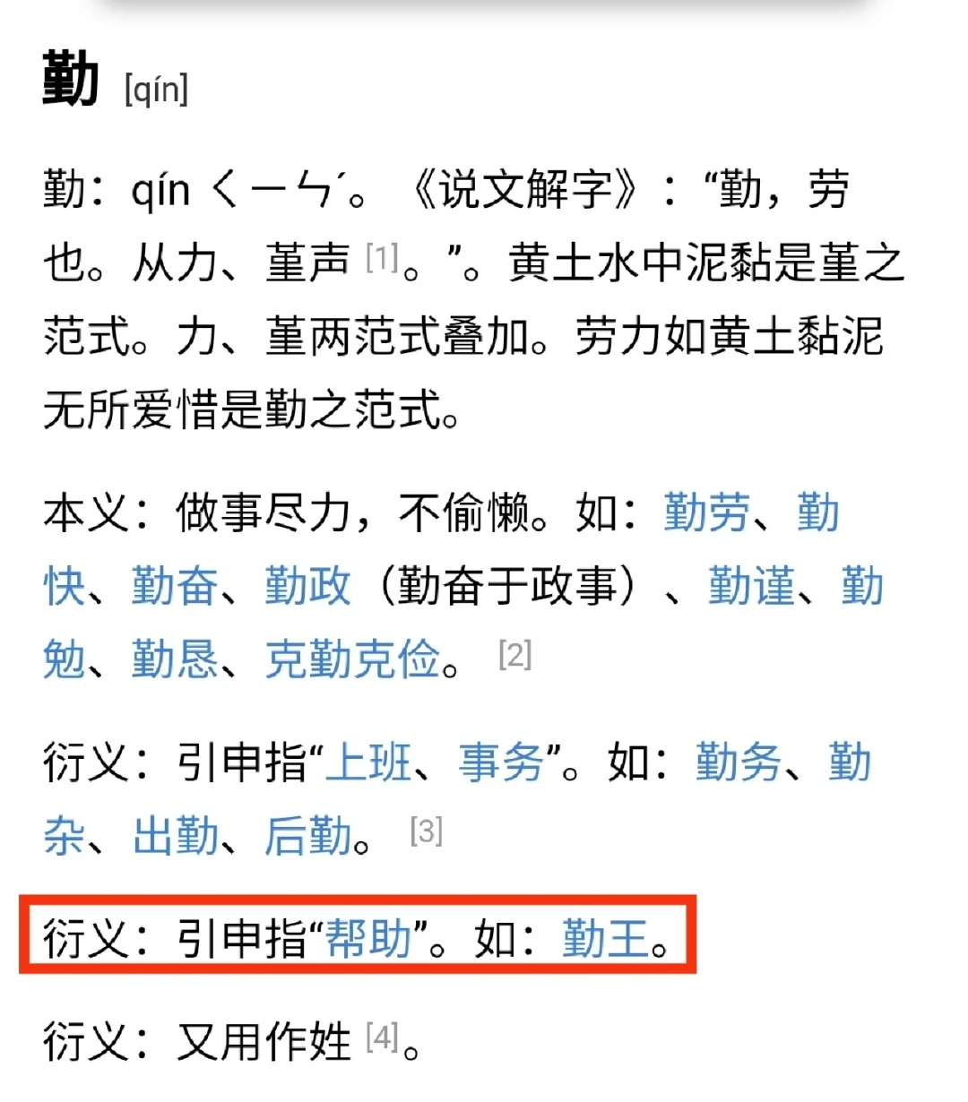 🌈“勤王”意思是君主制国家中君王有难,而臣下起兵救援君王(皇帝)。