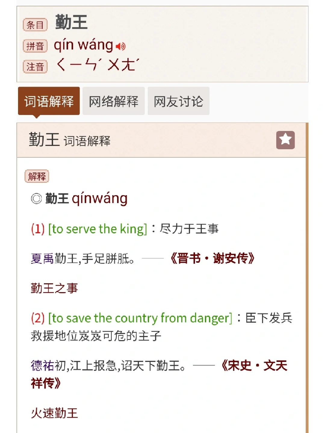 🌟出自《左传·僖公二十五年》:“狐偃言於晋侯曰:‘求诸侯莫如勤王。’”这里的“勤王”就是支持出奔在外的周襄王,帮助他恢复天子的名位,后世就把出兵救援帝王叫“勤王”。