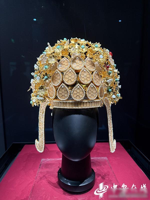 展览以中国目前最早的金饰为切入点,联合三星堆、金沙、武王墩、燕下都、海昏侯、何家村、法门寺、江口沉银、明定陵等全国重要遗址的精品文物,如四川省文物考古研究院藏三星堆商代金面具、内蒙古博物院藏北魏鹿角金步摇、扬州中国大运河博物馆藏隋代萧皇后冠、安徽博物院藏南宋葵花型金盏、南京博物院藏明代金蝉玉叶、明十三陵博物馆藏万历皇帝乌纱翼善冠、铜陵博物馆藏碧玺石金螃蟹等多件重量级“网红”展品。这些熠熠生辉的国宝珍品,不仅展现了古代工匠登峰造极的技艺,更承载着中华民族的礼仪信仰、审美情趣与时代精神。