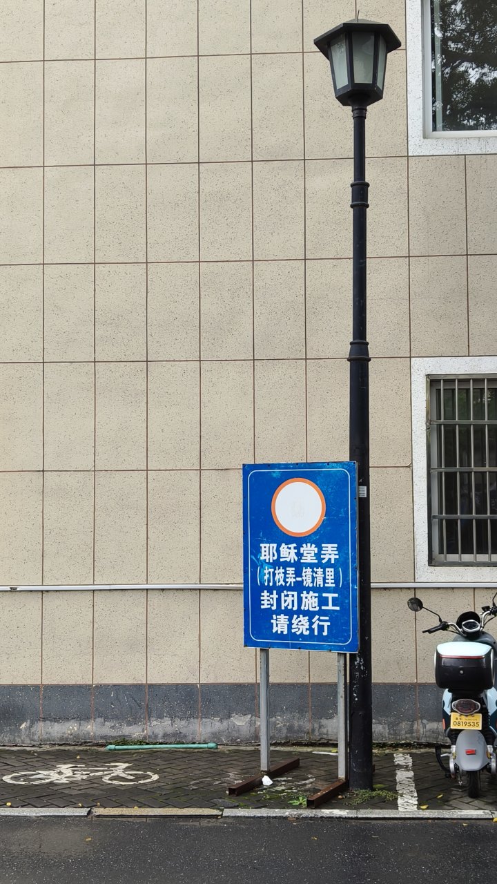 在弄堂口的天主教堂对面,有一块指示路牌。路牌显示“耶稣堂弄(打枝弄–镜清里)封闭施工,请绕行”。