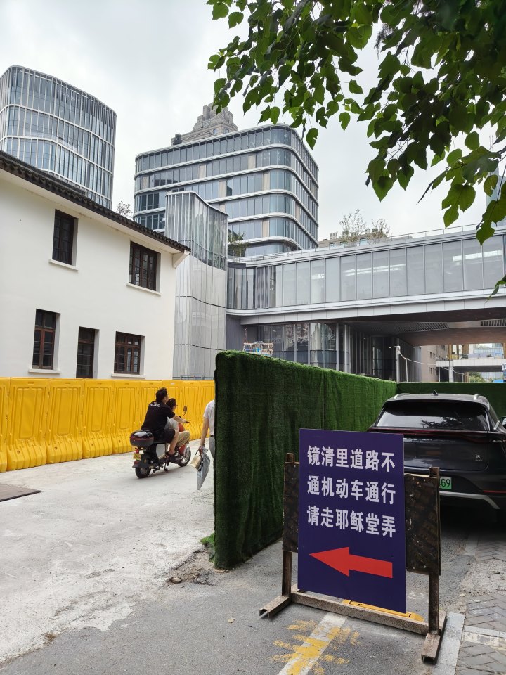 不过,正如路牌所示,位于耶稣堂弄中段北侧的镜清弄仍在施工阶段,但走路或骑车的还是可以从这里直穿到体育场路的粮油大厦。再往西一些的打枝弄,目前依旧处于封闭状态。