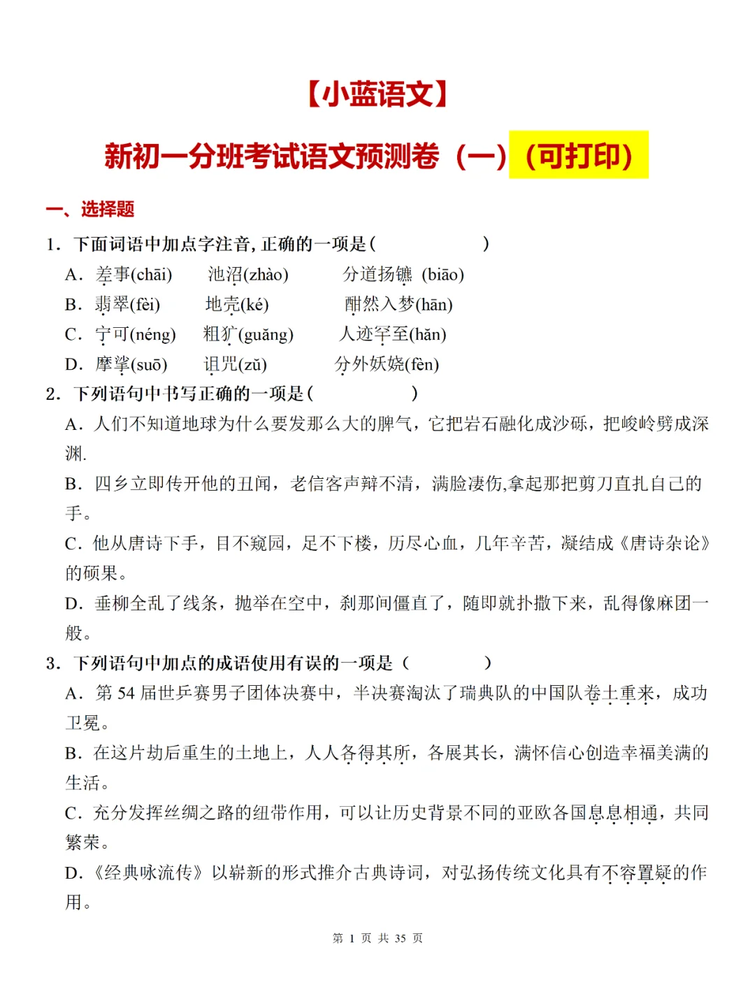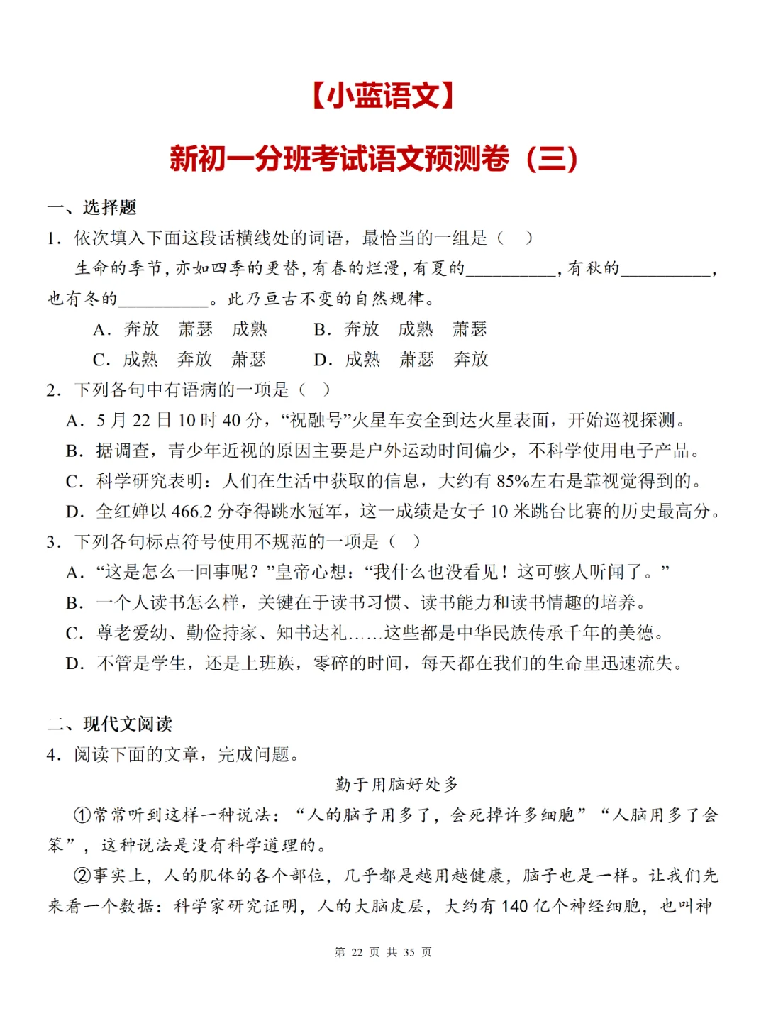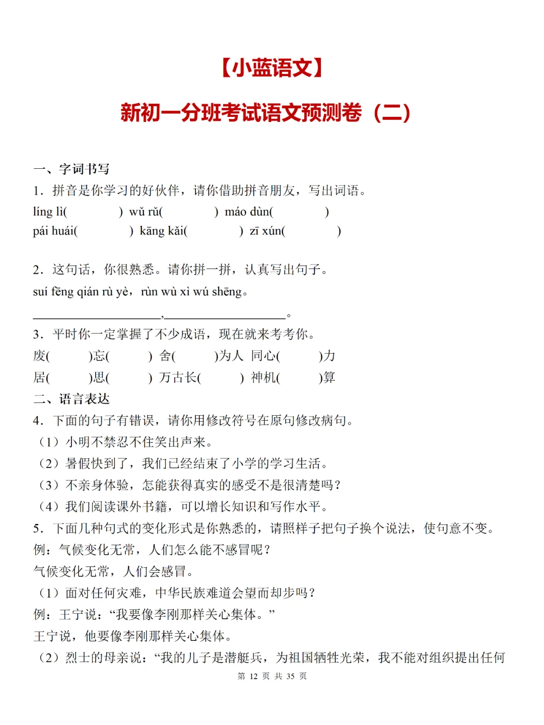 💥小升初暑假已过半,大家要开始收心了,尤其是开学有分班考的孩子,在暑假不能太放松。 . 💕这里给大家整理了3份,我觉得比较好的新初一分班考试语文模拟测试卷给大家。这些试卷都是来自一些典型的M校,有些敏感就不说了。 . ❗开学考试前,一定要打印出来练习一下,练完你就知道分班考跟平时的考试有什么不同?知识点范围是什么?难度怎么样?一定要自己动手去写了,才能感受得到。 . 回顾知识点,加深记忆 训练手感,避免发挥失常 . 💪关于小升初分班语文考试,还有什么问题,欢迎提问,有问必答✅