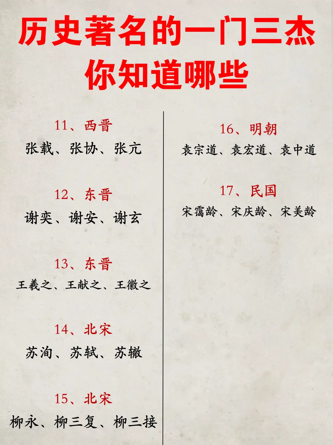 历史上著名的“一门三杰”你知道哪些? 📕苏洵、苏轼与苏辙这父子三人组成的 “三苏” 广为人知。时光流转至近代,宋氏三姐妹亦在历史舞台上留下浓墨重彩的一笔。 📕中华民族自古以来就秉持着 “打虎亲兄弟,上阵父子兵” 的理念,对于文化传承以及家庭教育更是极为看重。 正因如此,诸如 “一门三杰” 这般的家族盛景,乃至全家皆贤能出众的状况,都并非罕见之事,它们如同繁星点点,点缀着华夏文明浩瀚的历史苍穹!