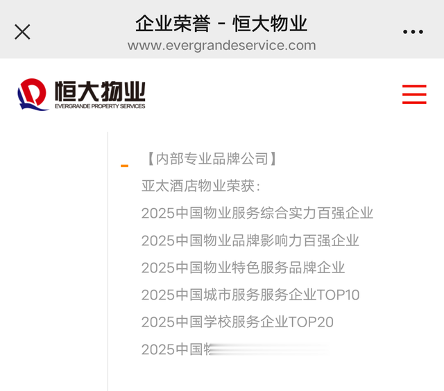 红星新闻在恒大物业官网“企业荣誉”板块看到,亚太酒店物业被归为“恒大物业企业成员”“内部专业品牌公司”。
