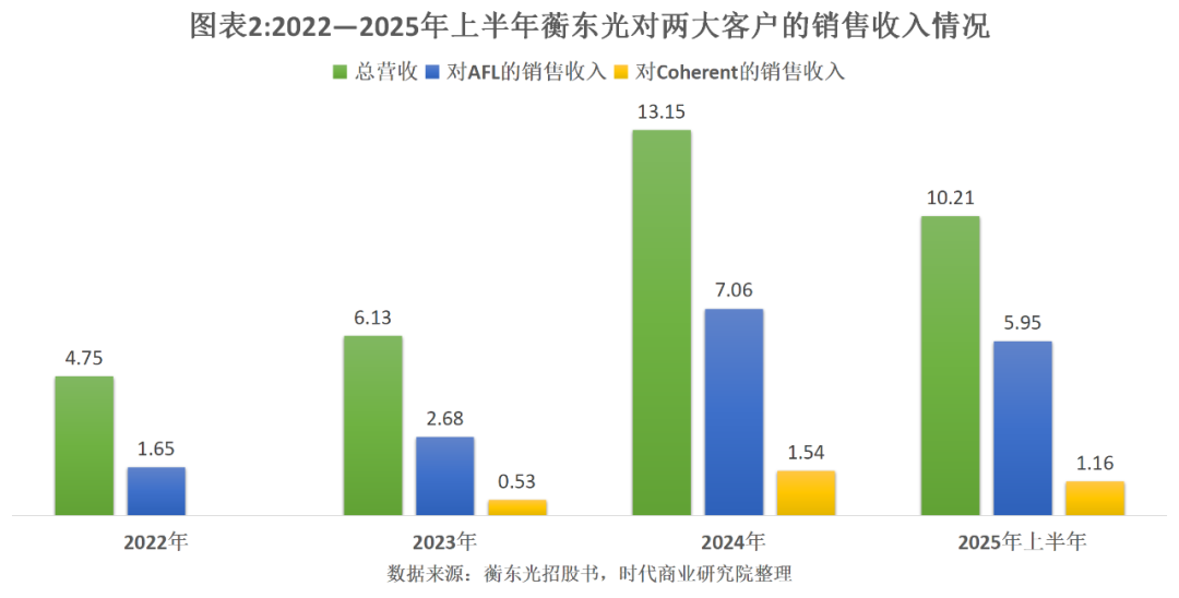 招股书显示,报告期各期,蘅东光前五大客户集中度分别为66.74%、67.85%、76.97%、79.87%。其中,AFL是其第一大客户,报告期各期,蘅东光对AFL的销售收入分别为1.65亿元、2.68亿元、7.06亿元、5.95亿元,占总营收的比例分别为34.80%、43.64%、53.71%、58.22%。