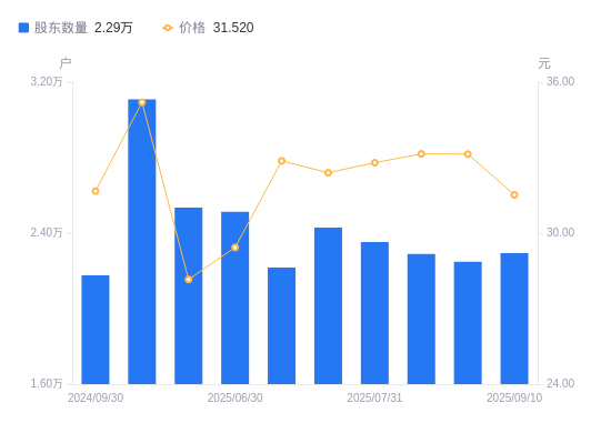 日期A股户数(户)流通A股户均持股数(股)户均持股市值(万元)2025-08-29224809377.9831.082025-08-08228969207.5930.522025-07-31235348957.9829.382025-07-18242888679.8828.122025-07-10221769506.5431.252025-06-30251278390.0624.692025-03-31253518315.9223.422024-12-31310876781.5223.872024-09-30217719761.8430.922024-08-30214509907.9224.18