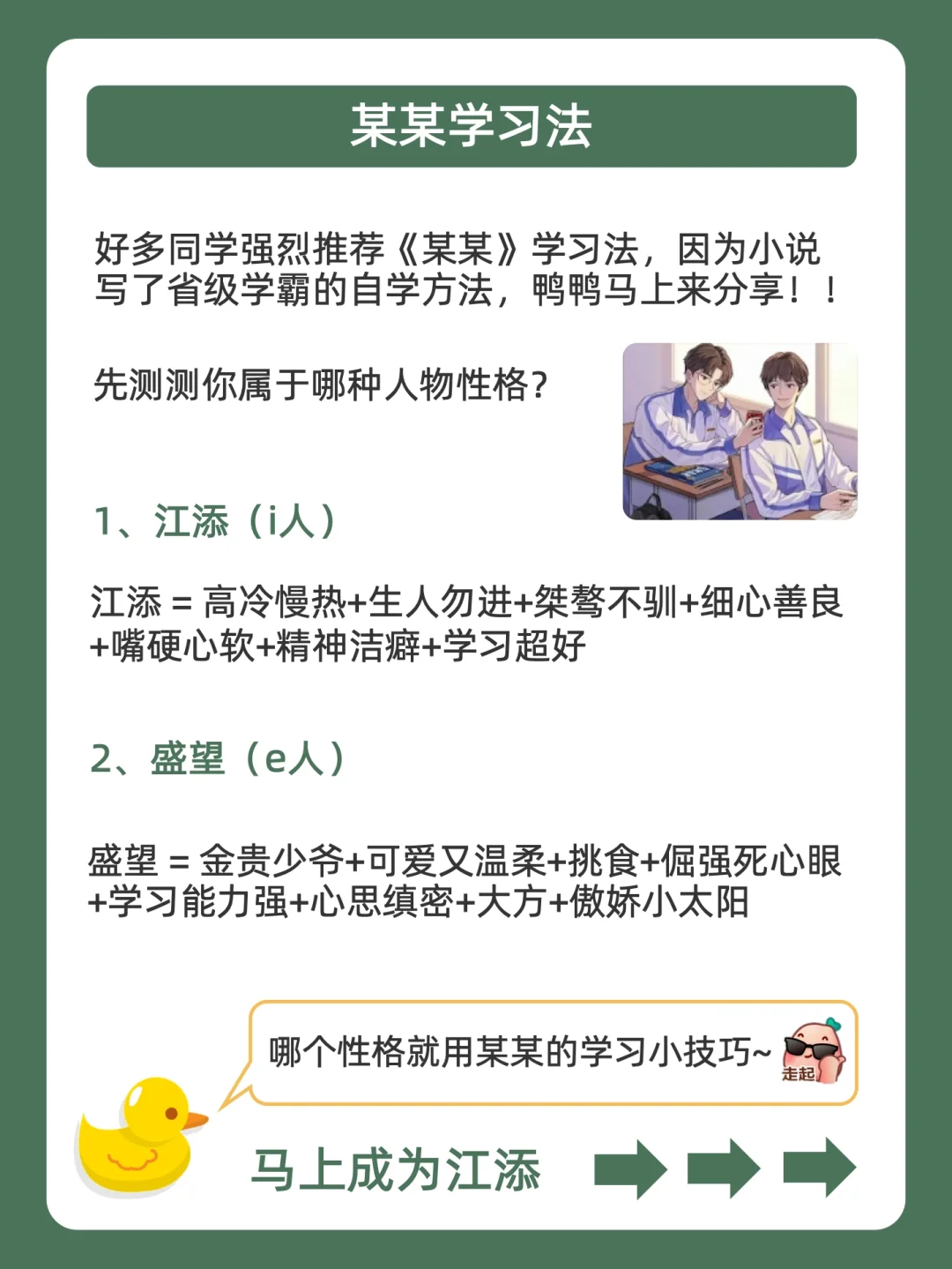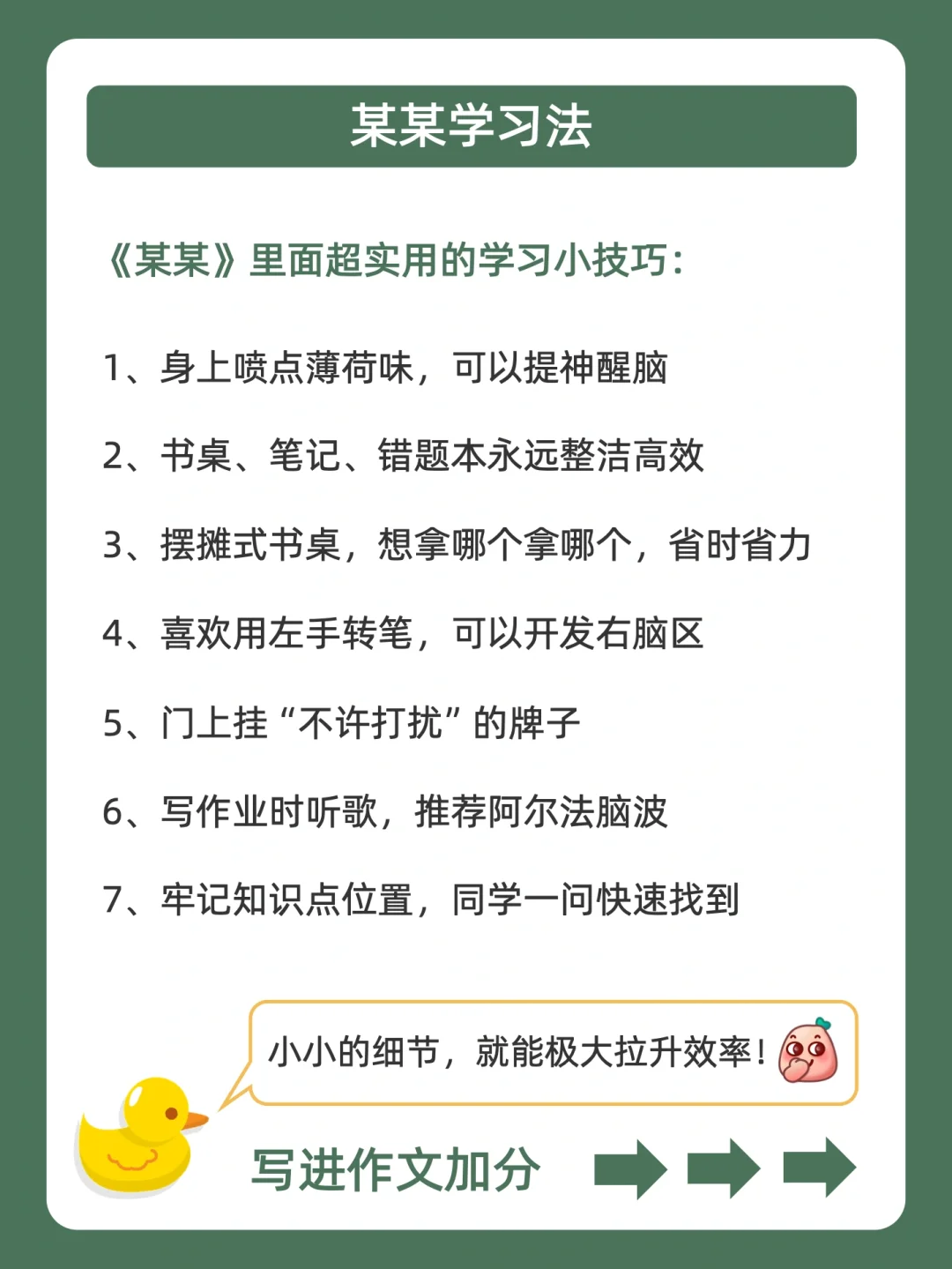 . [赞R]用学习方法帮你变成学霸,是鸭鸭的责任❗ . [向右R]好多同学投稿某某学习法,想边看小说边当学霸![石化R] . [点赞R]鸭鸭这么宠粉,马上就来实现宝子们的愿望![偷笑R] . [向右R]今天就来分享,灵感来自的某某学习法,都在上面的图,看完就会用!从此嗑糖学习,逆袭学霸![飞吻R] . 🐣我是鸭鸭,持续更新优质学习笔记,陪宝子们快乐学习,驰骋学海!🌊