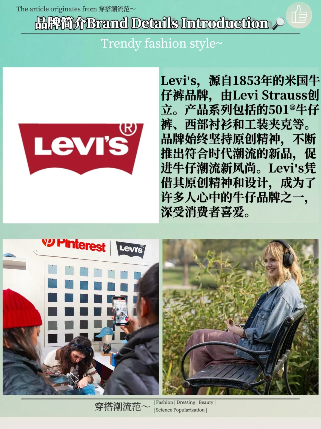 Levi's,源自1853年的米国牛仔裤品牌,由Levi Strauss创立。产品系列包括的501®牛仔裤、西部衬衫和工装夹克等。品牌始终坚持原创精神,不断推出符合时代潮流的新品,促进牛仔潮流新风尚。Levi's凭借其原创精神和设计,成为了许多人心中的牛仔品牌之一,深受消费者喜爱。