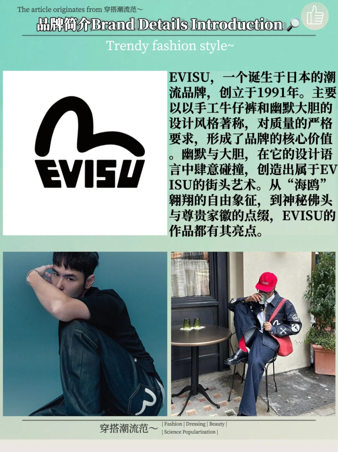 EVISU,一个诞生于日本的潮流品牌,创立于1991年。主要以以手工牛仔裤和幽默大胆的设计风格著称,对质量的严格要求,形成了品牌的核心价值。幽默与大胆,在它的设计语言中肆意碰撞,创造出属于EVISU的街头艺术。从“海鸥”翱翔的自由象征,到神秘佛头与尊贵家徽的点缀,EVISU的作品都有其亮点。