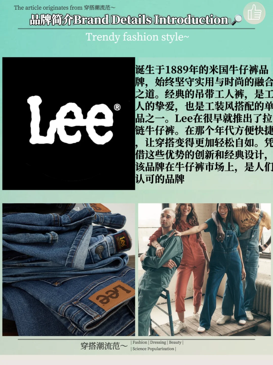 诞生于1889年的米国牛仔裤品牌,始终坚守实用与时尚的融合之道。经典的吊带工人裤,是工人的挚爱,也是工装风搭配的单品之一。Lee在很早就推出了拉链牛仔裤。在那个年代方便快捷,让穿搭变得更加轻松自如。凭借这些优势的创新和经典设计,该品牌在牛仔裤市场上,是人们认可的品牌