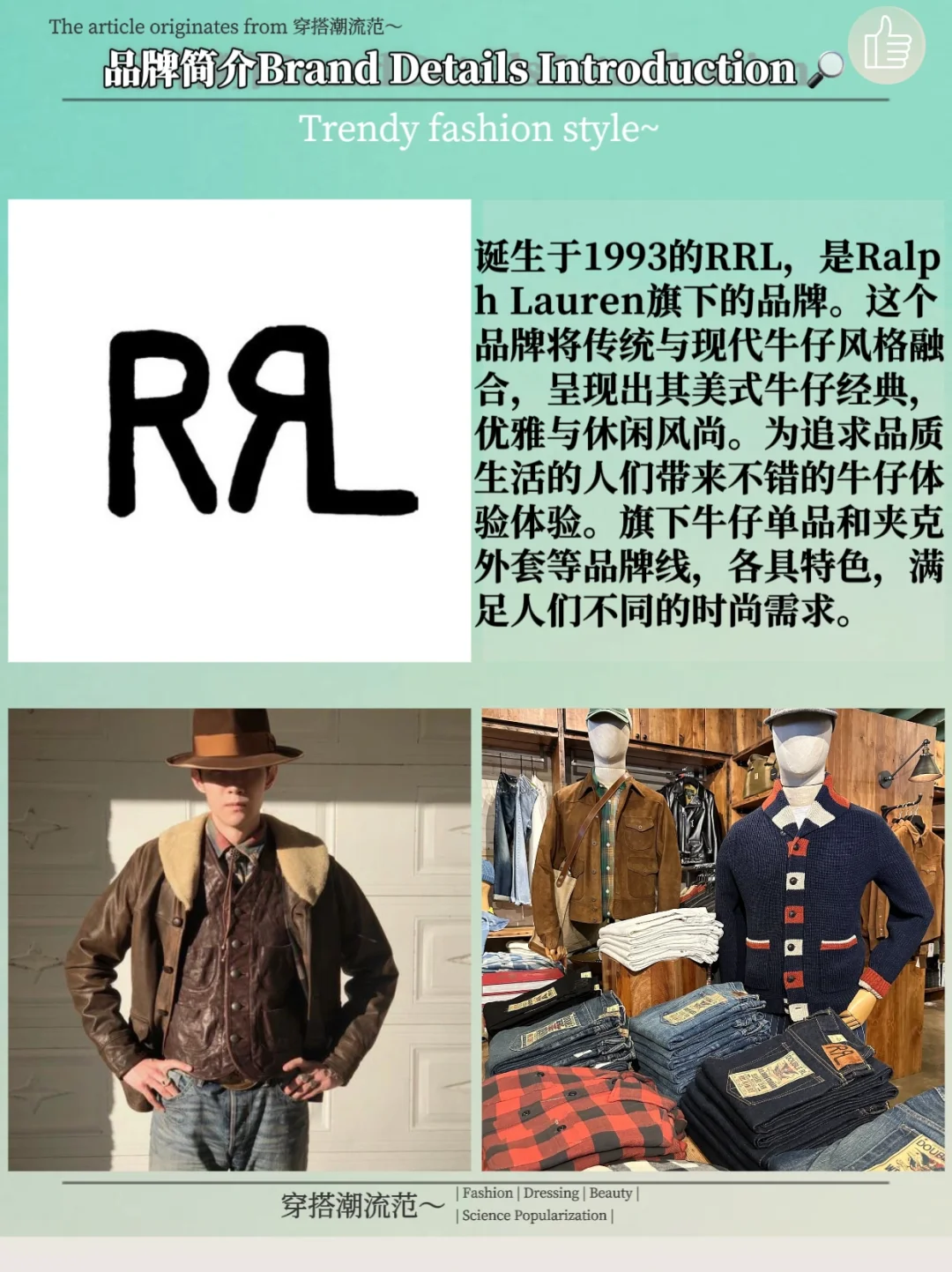 诞生于1993的RRL,是Ralph Lauren旗下的品牌。这个品牌将传统与现代牛仔风格融合,呈现出其美式牛仔经典,优雅与休闲风尚。为追求品质生活的人们带来不错的牛仔体验体验。旗下牛仔单品和夹克外套等品牌线,各具特色,满足人们不同的时尚需求。