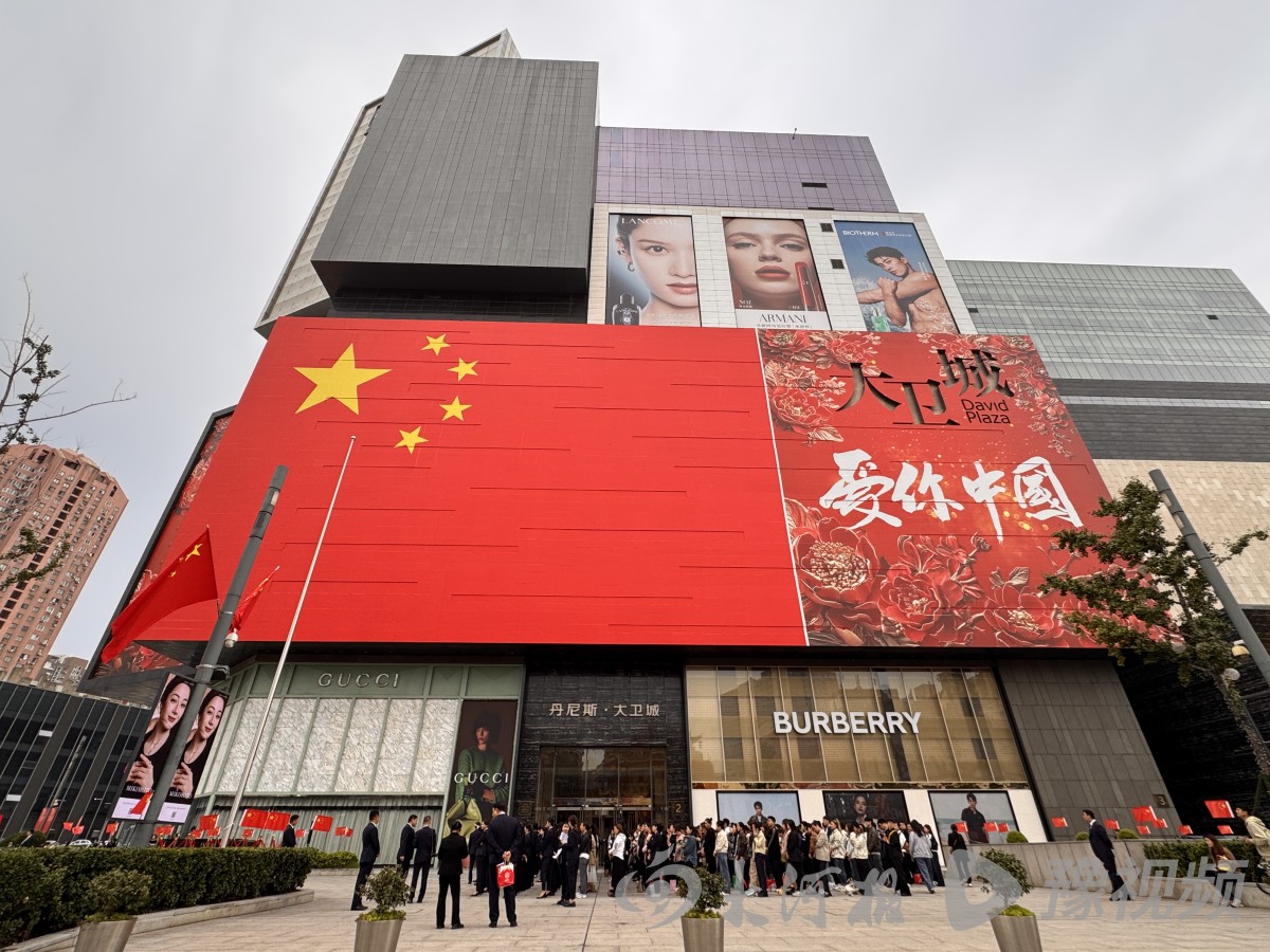 郑州二七商圈成了红色的海洋。当天上午,郑州市大卫城等商场也举行了升国旗仪式,庆祝中华人民共和国成立76周年。
