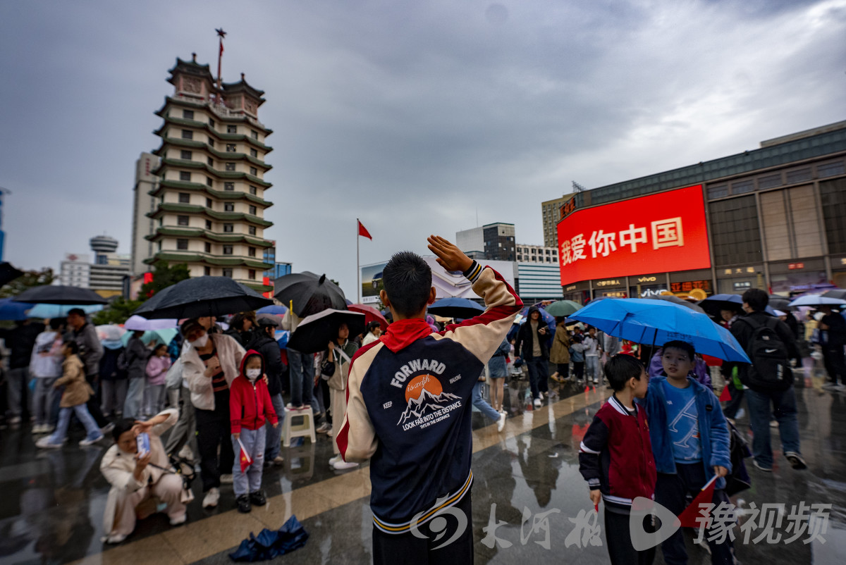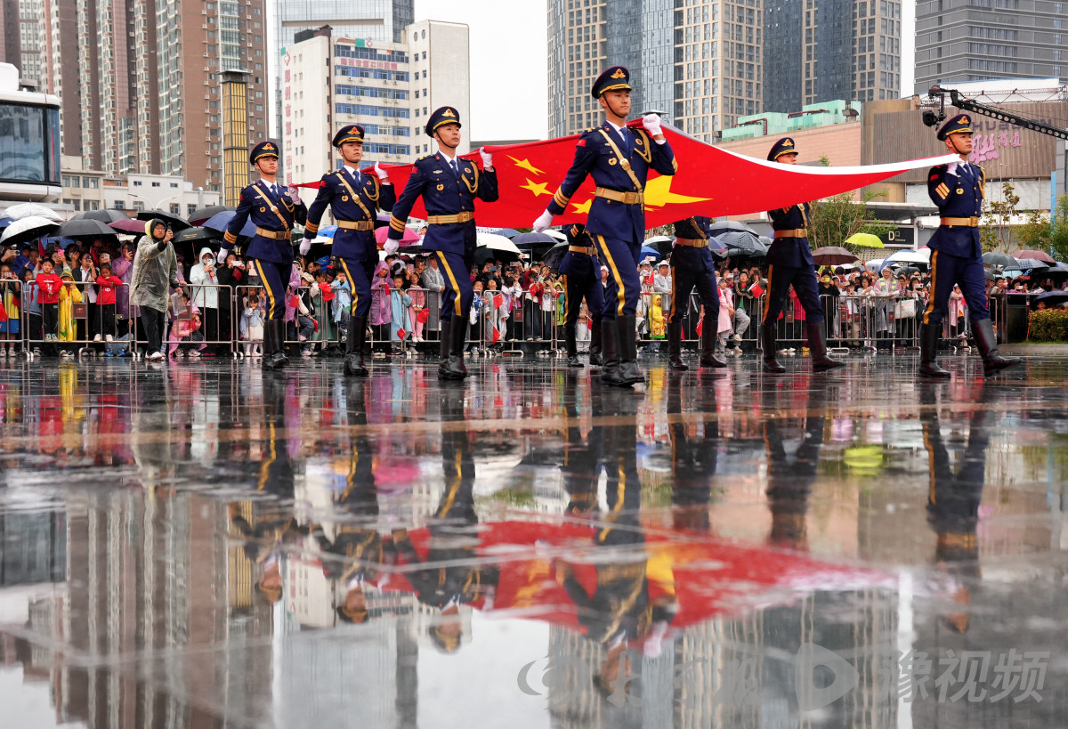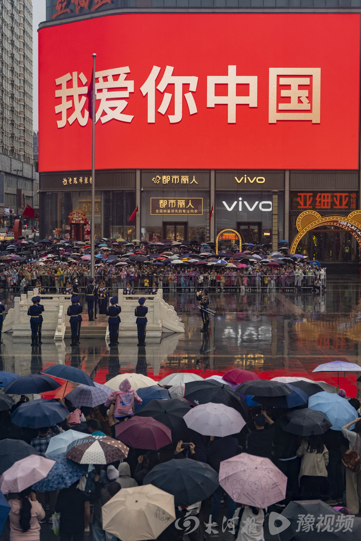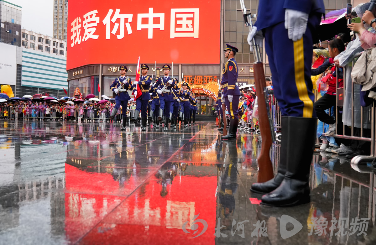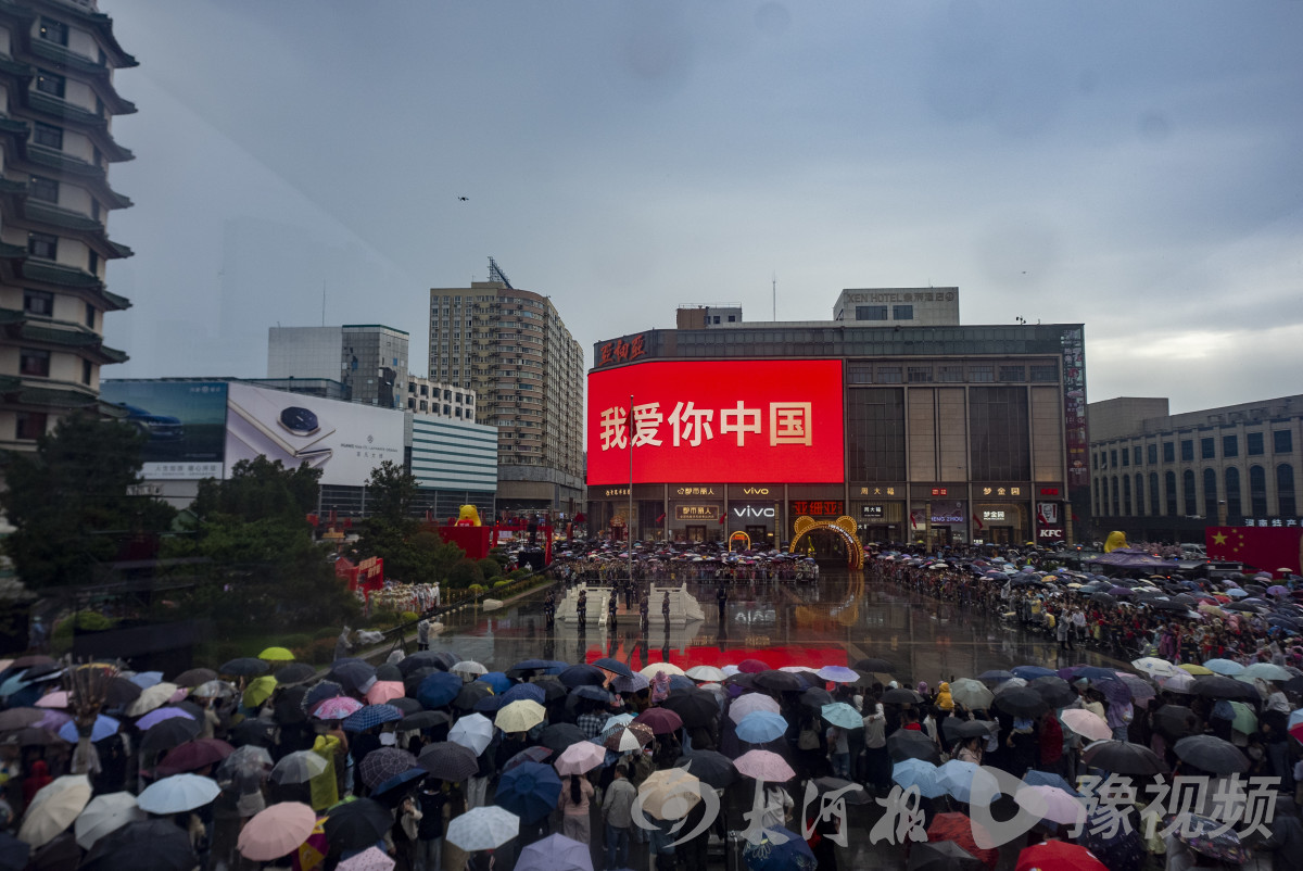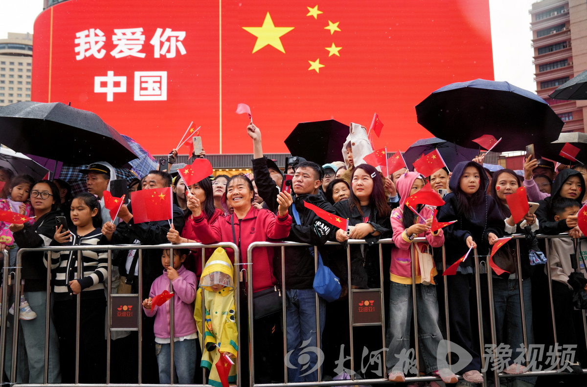 2025年10月1日上午,郑州二七广场举行隆重的国庆节升国旗仪式,吸引了上千市民冒雨前来观看。