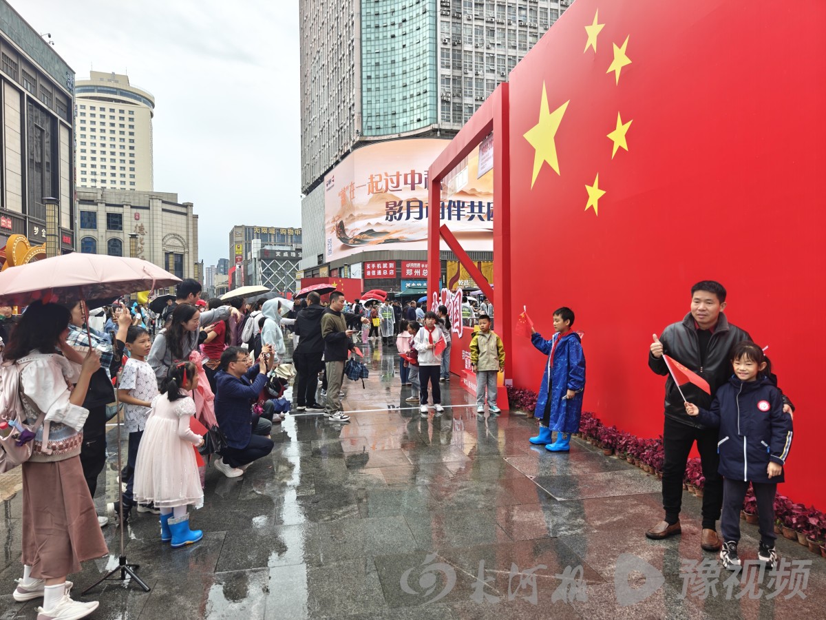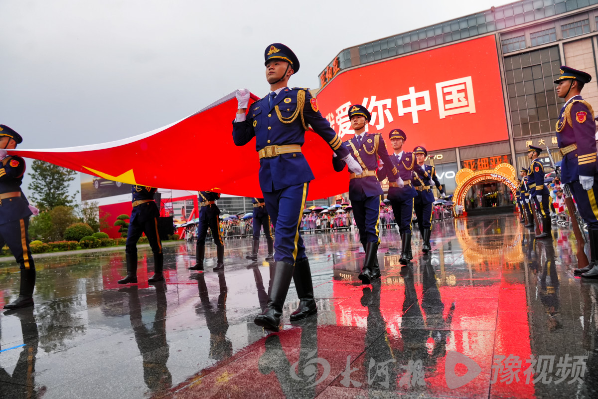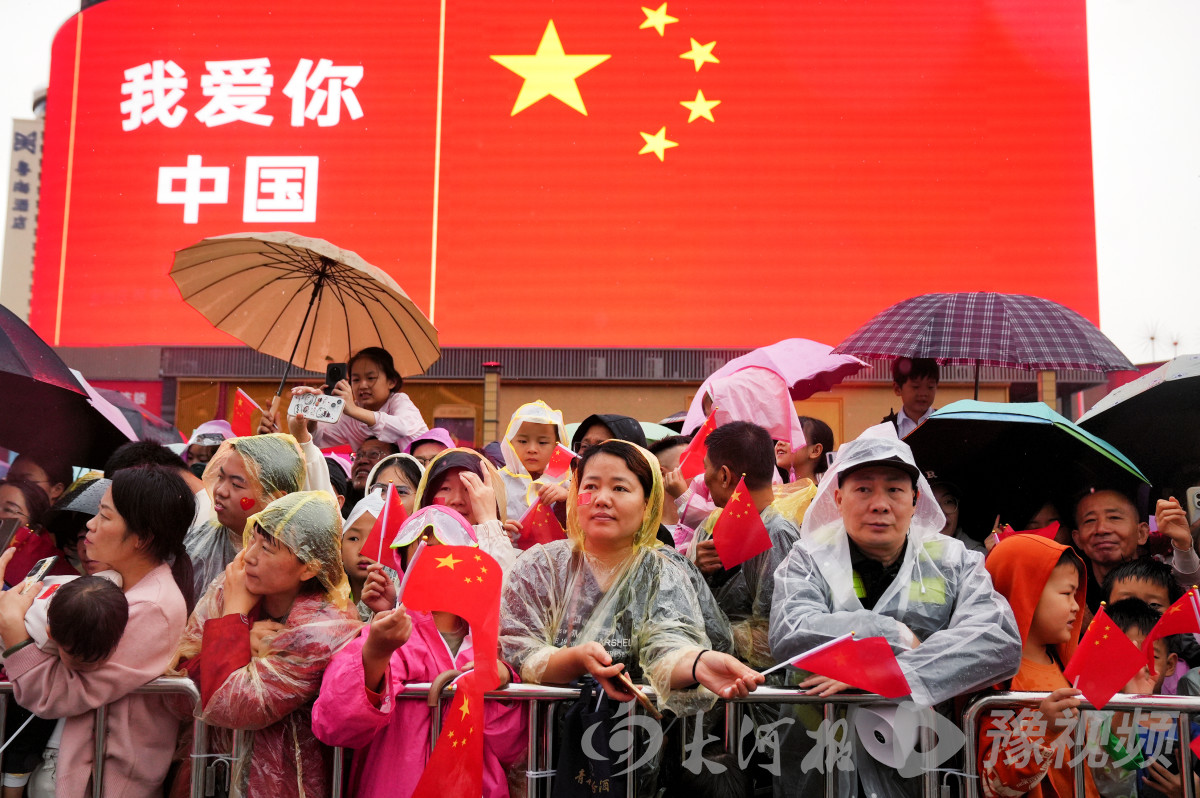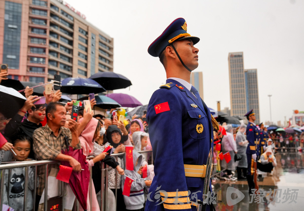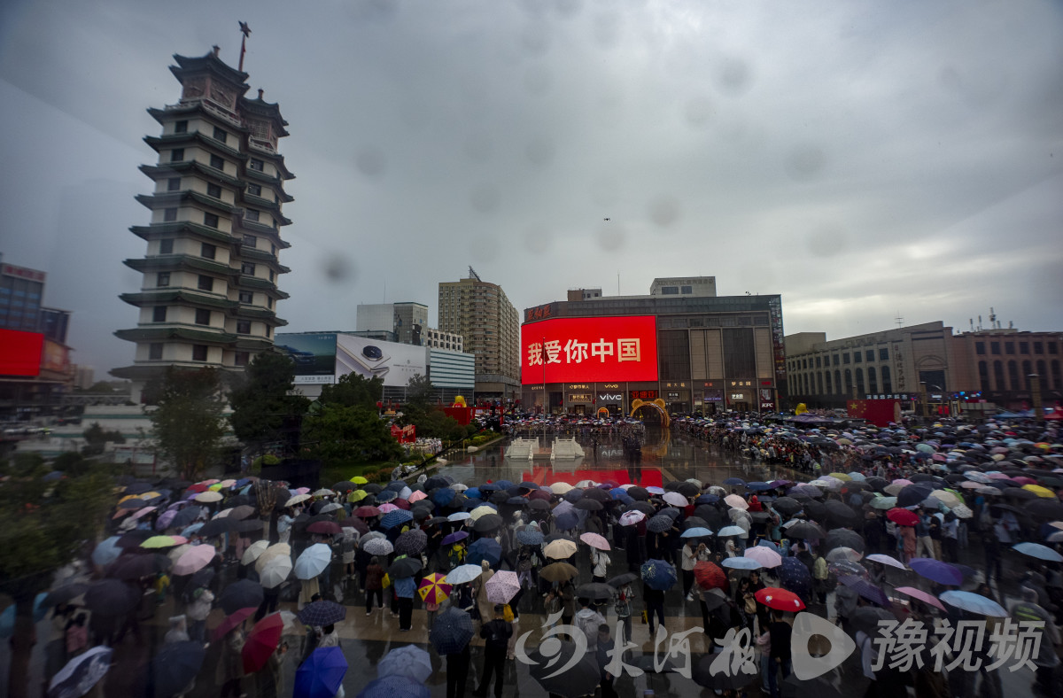 2025年10月1日上午,郑州二七广场举行隆重的国庆节升国旗仪式,吸引了上千市民冒雨前来观看。