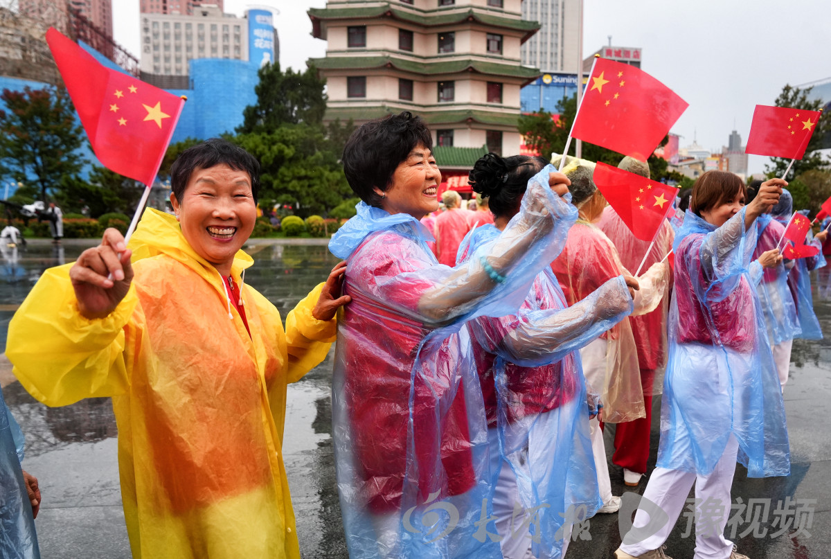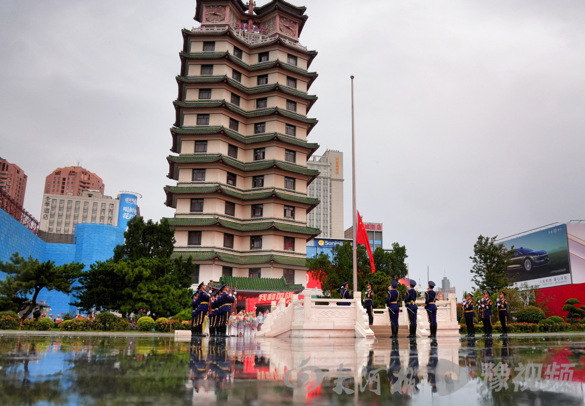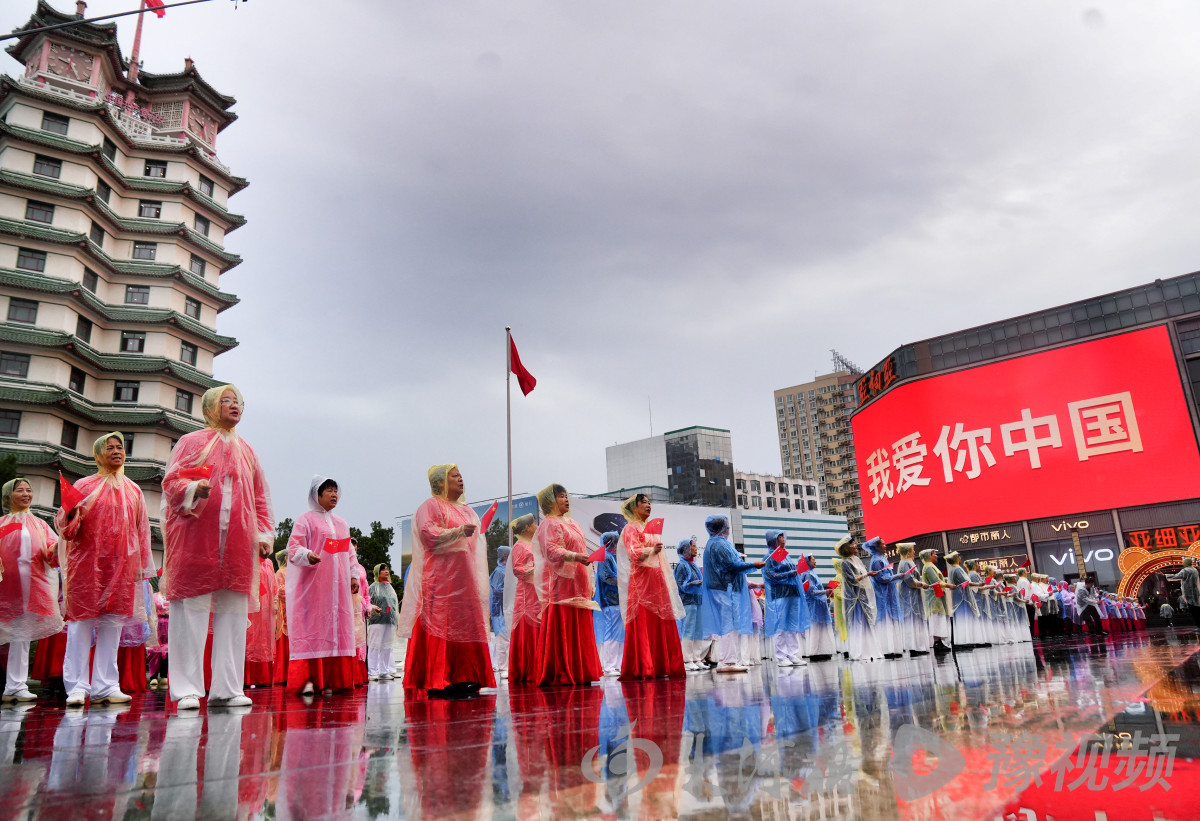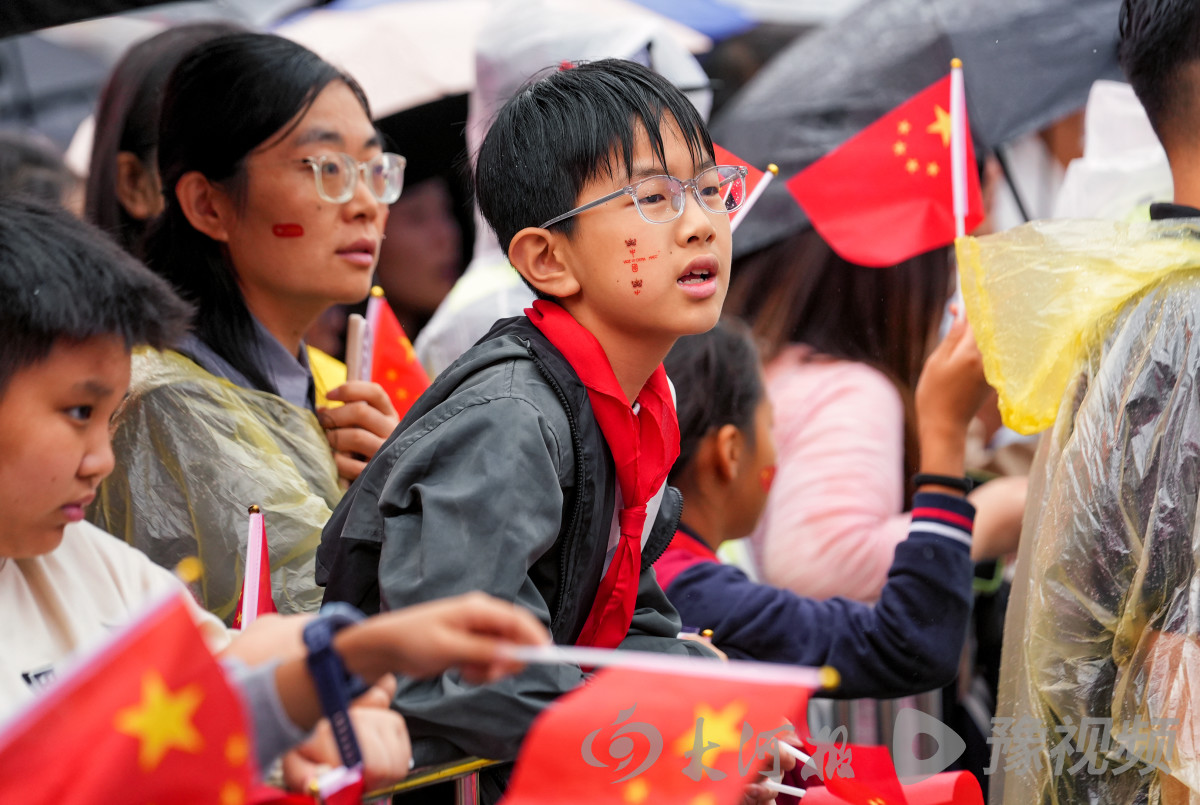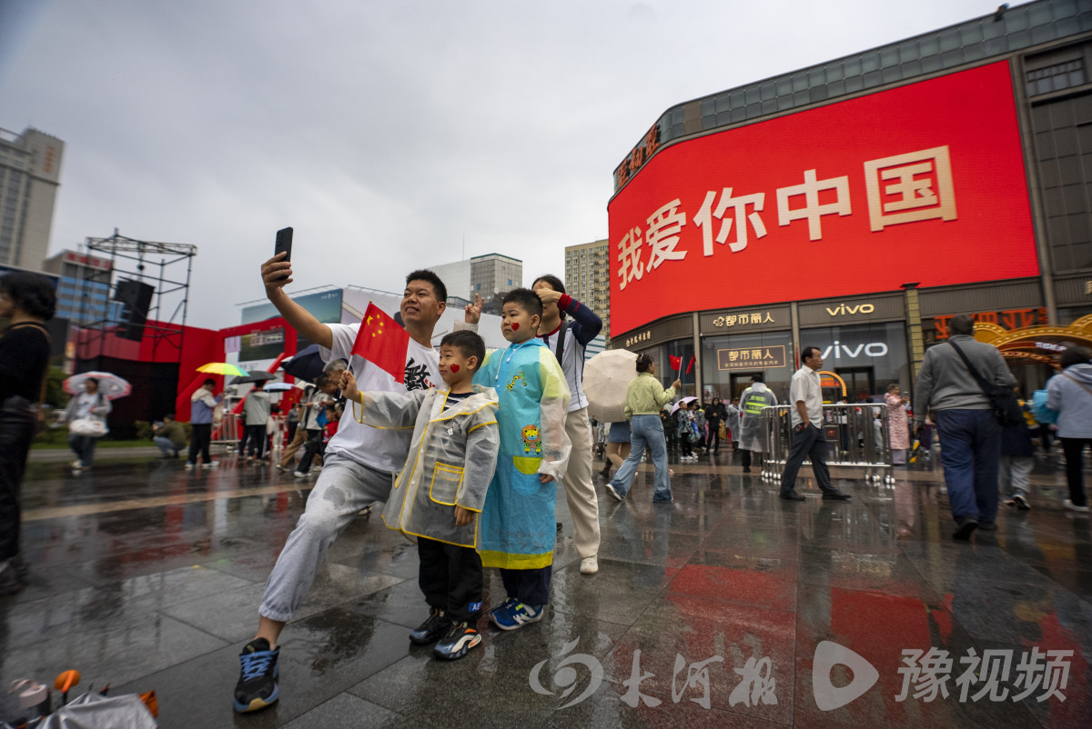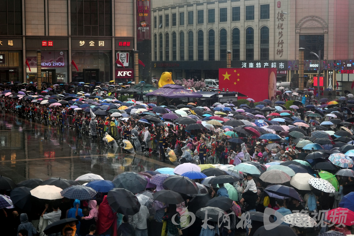 2025年10月1日上午,郑州二七广场举行隆重的国庆节升国旗仪式,吸引了上千市民冒雨前来观看。