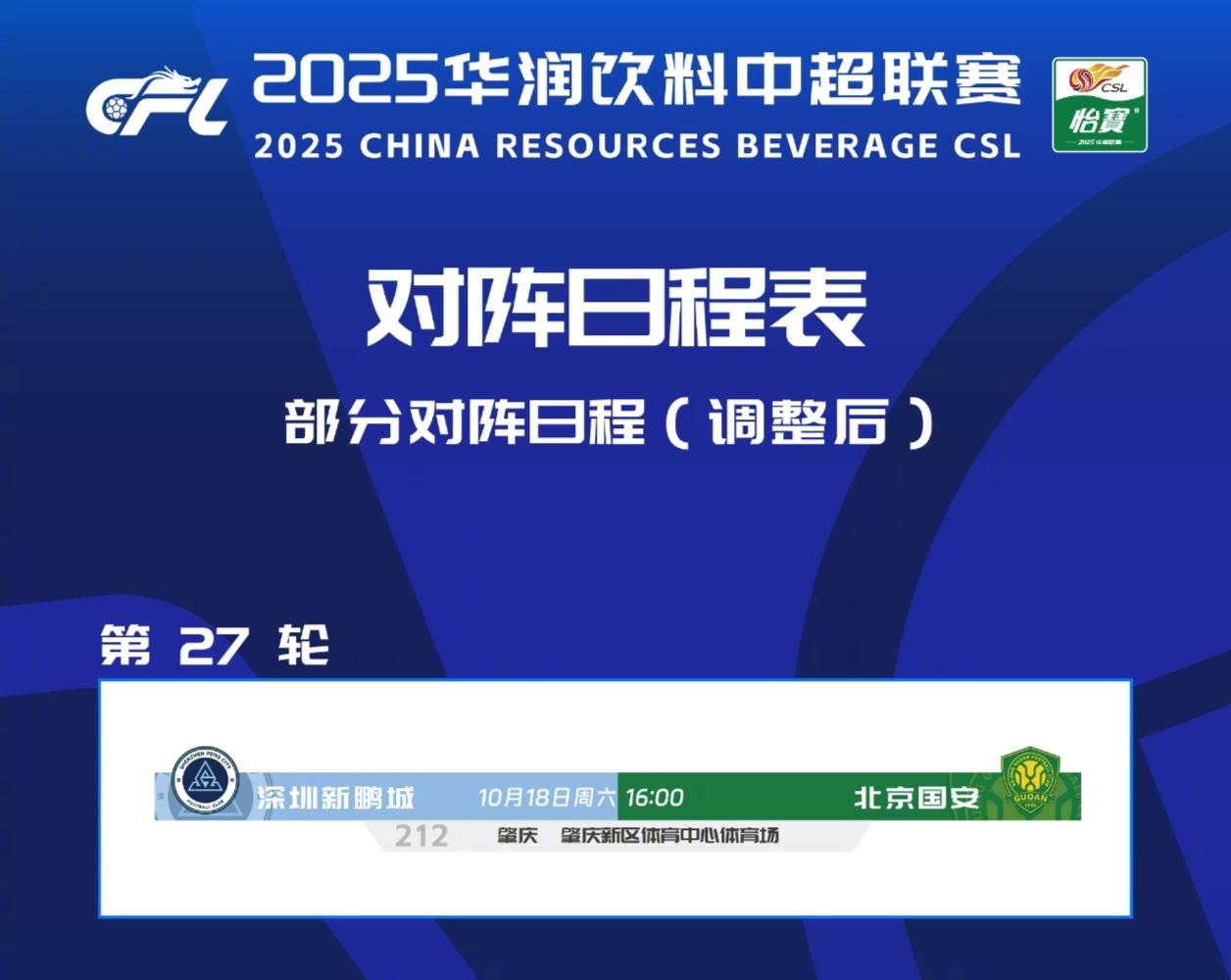 根据2025华润饮料中超联赛赛程,深圳新鹏城对阵北京国安的比赛将于10月17日20:00在深圳市体育中心体育场进行,因深圳赛区举办第十五届全运会足球男子U18比赛,为保证本场比赛安全有序进行。经深圳新鹏城足球俱乐部申请,协商深圳赛区、北京国安足球俱乐部以及有关方面同意,现决定将深圳新鹏城对阵北京国安比赛进行调整,具体调整如下:
