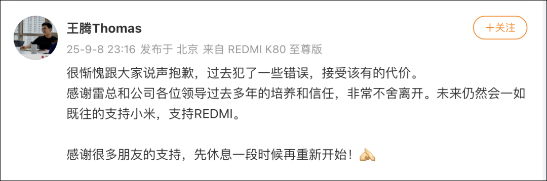随后,王腾发布微博回应被小米辞退:很惭愧跟大家说声抱歉,过去犯了一些错误,接受该有的代价。