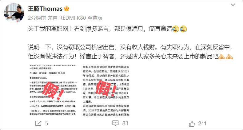 9月9日,王腾再发文回应被小米辞退,其表示没有窃取公司机密出售,没有收人钱财。有失职行为,在深刻反省中,但没有做违法行为!