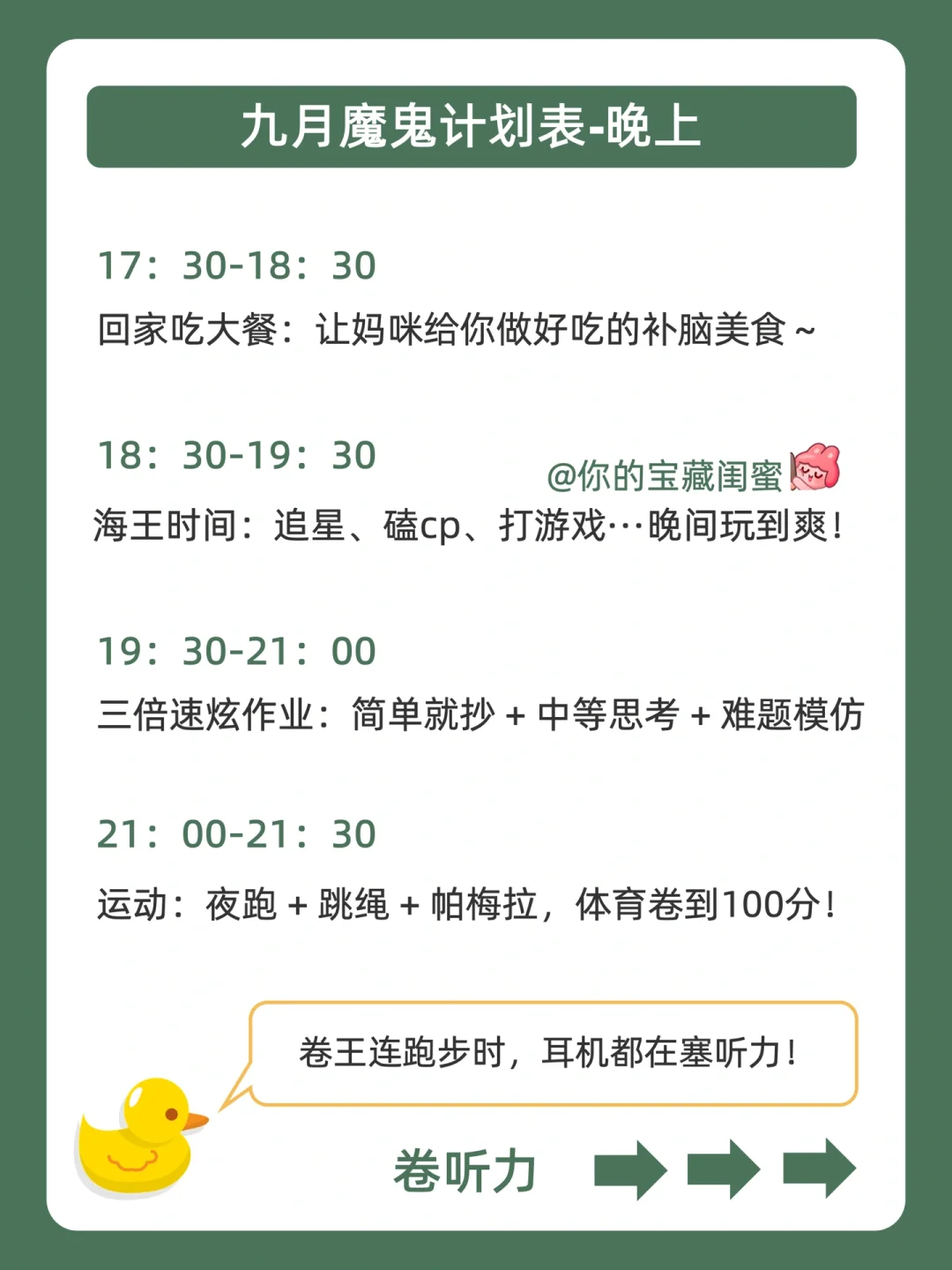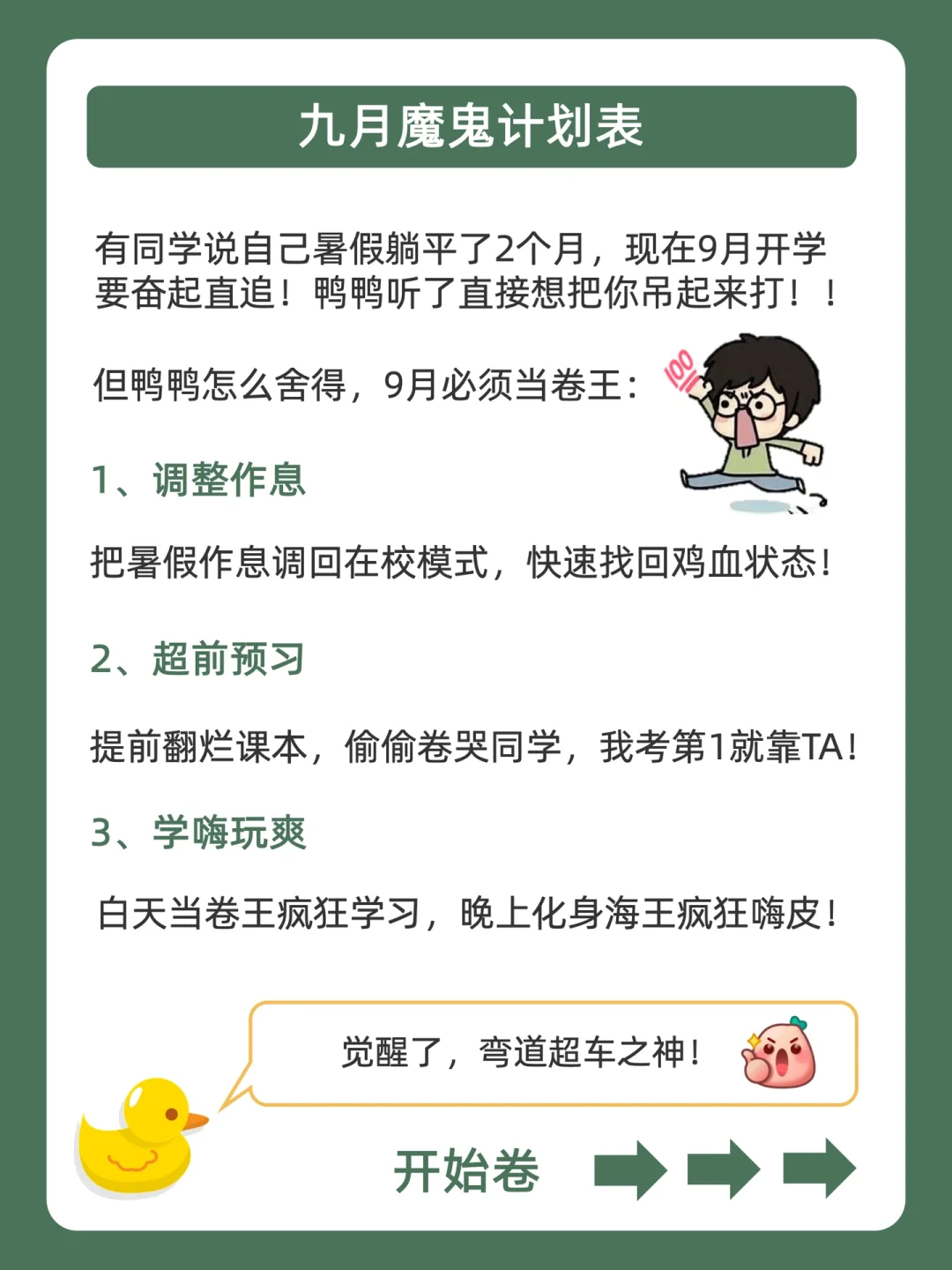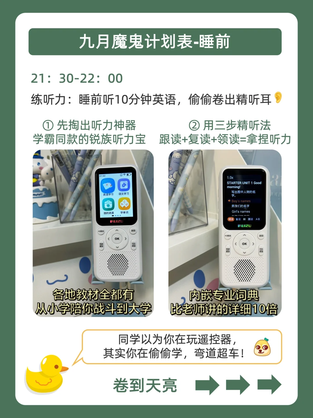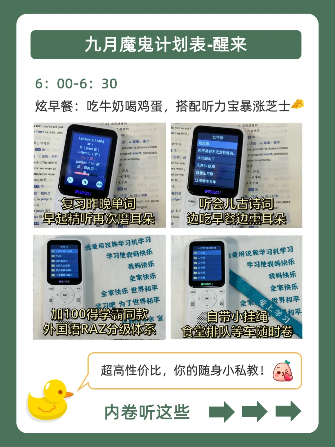 . [赞R]开学摆烂不用怕,鸭鸭带你做学霸❗ . [向右R]有同学说马上9月开学了,啥也没规划慌得一批![石化R] . [飞吻R]鸭鸭这么宠粉,肯定会全力以赴帮助你们的哇![赞R] . 今天就来分享,9月开学魔鬼计划表,搭配卷王神器锐族听力宝!从此偷偷内卷,逆袭学霸![赞R] . ️🐣我是鸭鸭,持续更新优质学习方法,陪宝子们逆袭学霸,驰骋学海!🌊
