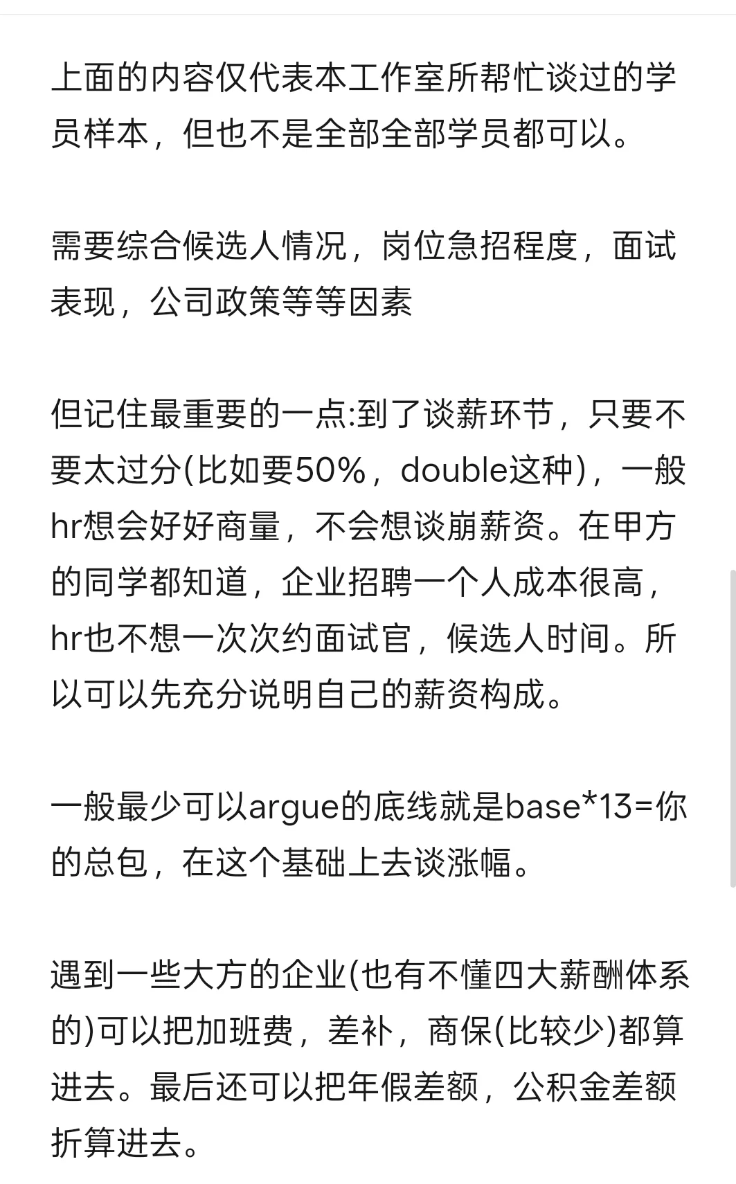 遇到一些大方的企业(也有不懂四大薪酬体系的)可以把加班费,差补,商保(比较少)都算进去。最后还可以把年假差额,公积金差额折算进去。