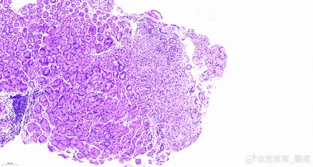 上周做的一个胃镜,40+女性。胃体大弯几毫米的很薄一片褪色,觉得可能有问题,取了一块活检(可惜不能放内镜图,不过放了你们应该也看不出来[笑哭R][笑哭R])。周一黎叔跟我联系,问我病变情况,说考虑印戒,但太小了,腺颈部少量印戒细胞,所以来跟我确认。虽然当时有怀疑,我还是吃了一惊,果然是印戒…无敌庆幸我们有早癌病理专家黎叔,佩服黎叔的超强病理诊断水平,很少的细胞也被发现。对病人来说,确实是很幸运的事,胃印戒细胞癌在如此早阶段被发现被诊断,内镜技术在发展,内镜医生和病理医生诊断水平在提高,不是谈“印戒”色变了的时代了,越早发现越好,早期阶段esd完全可以达到治愈,做内镜医生的最大成就感也在于此。