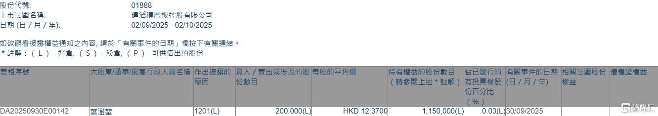 格隆汇10月2日丨根据联交所最新权益披露资料显示,2025年9月30日,建滔积层板(01888.HK)遭独立非执行董事叶澍堃在场内以每股均价12.37港元减持20万股,涉资约247.4万港元。