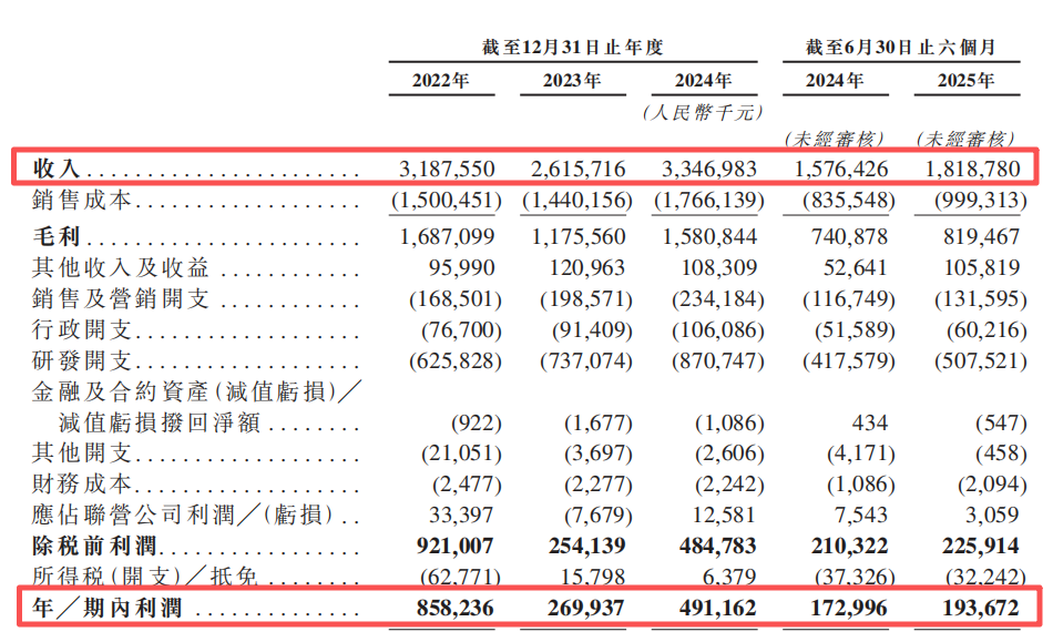 招股书显示,2022年、2023年、2024年及2025上半年,圣邦股份分别实现营收31.88亿元、26.16亿元、33.47亿元及18.19亿元;同期,公司净利润分别为8.58亿元、2.7亿元、4.91亿元及1.94亿元。