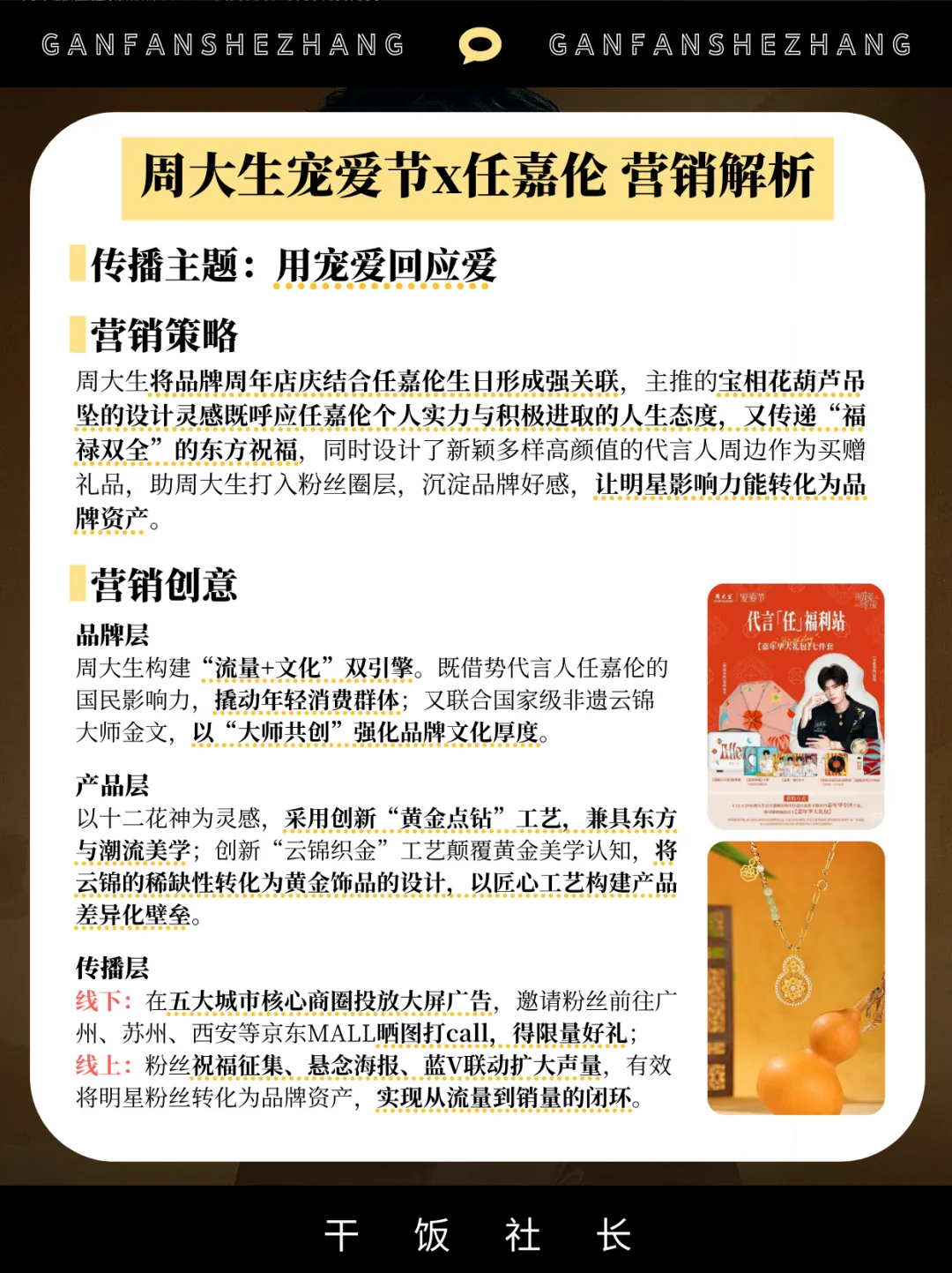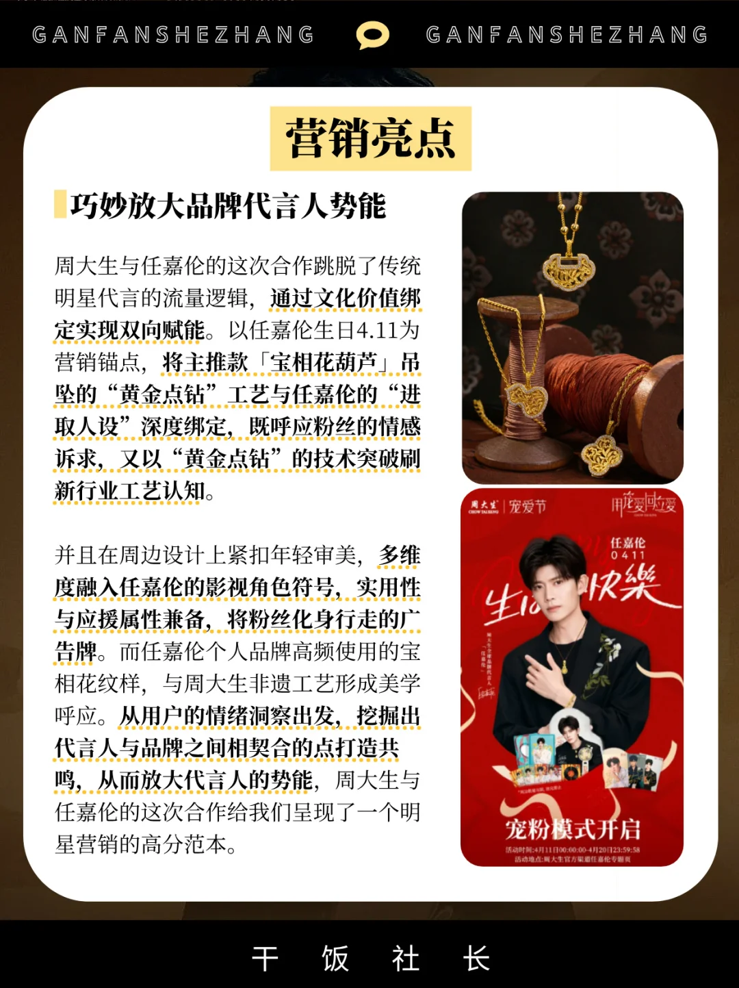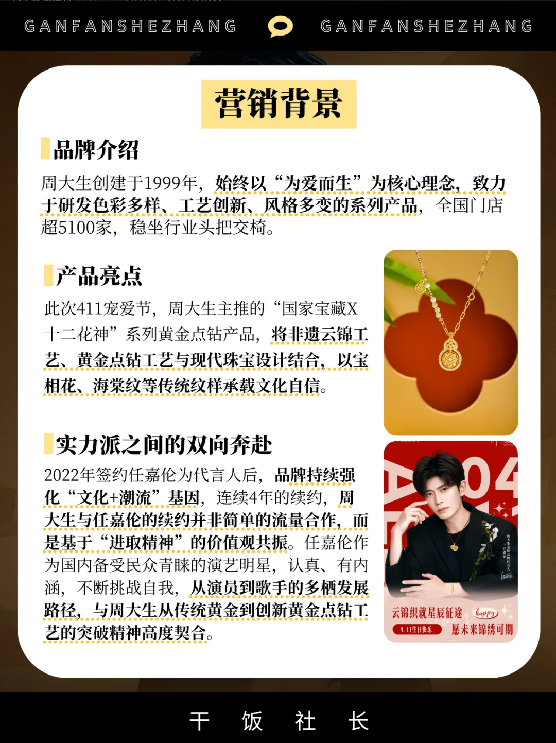 碎片化环境,明星营销有必要升级玩法 在明星的选择上,一定要和品牌的的调性相契合 同时在传播中以明星为核心,不断触达外层受众 只有将明星影响力真正转化为品牌传播力 才能真正为自身品牌创造品效口碑 近期,周大生携手代言人任嘉伦🌟 在今年411宠爱节发起的一场营销战役 不仅撬动传统文化与年轻群体的深度对话 通过非遗强化了周大生黄金点钻工艺心智 实现国家宝藏x十二花神黄金点钻的种草裂变 一起来看下周大生是如何将产品与代言人结合 并通过传统文化完成一场教科书级的营销范例